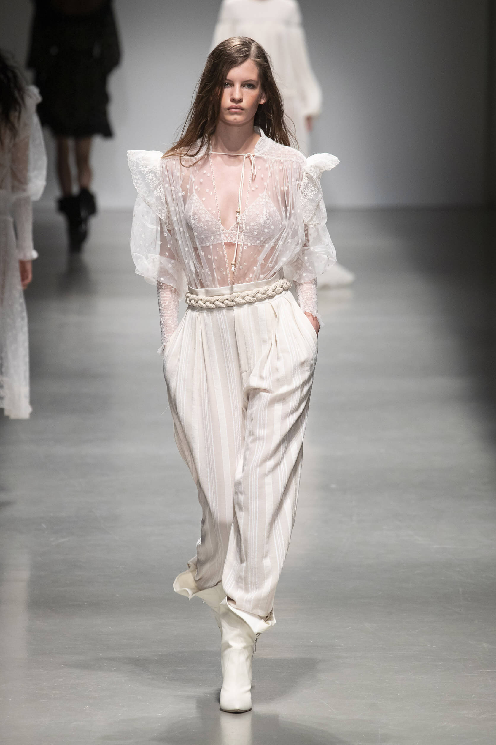La femminilità dei volant leggeri e raffinati, che contraddistinguono il brand da sempre, sdrammatizzano invece i colori scuri e le stampe pitone. Ma spiccano anche su abiti lunghi, color bianco sporco realizzati in pizzo o tessuto garzato e abiti a tunica hippie con inserti in pizzo.