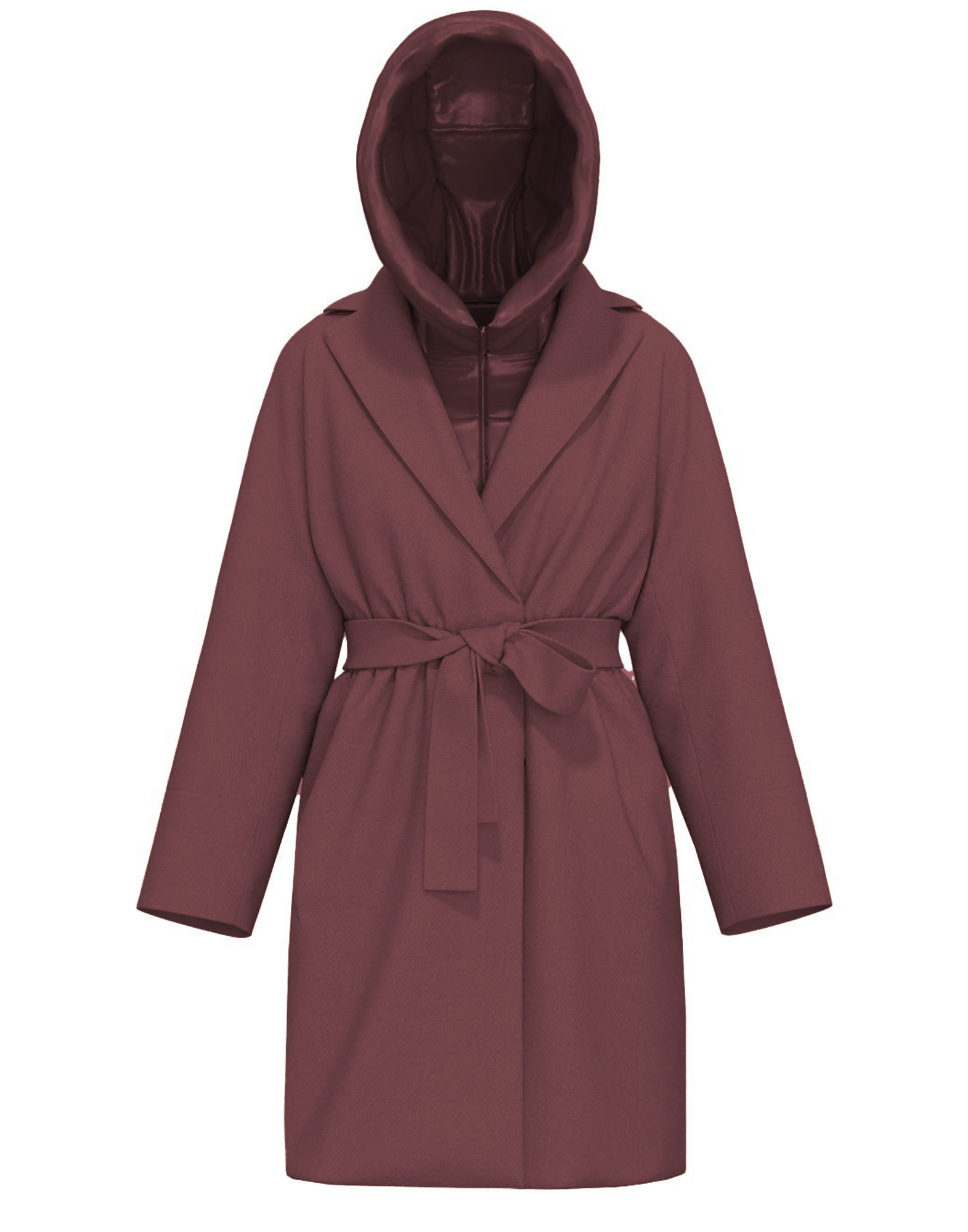 This soft wool coat combines functionality and style with its design: removable hood and bib, belted waist, and kimono sleeves that add a contemporary touch. A versatile ally, designed to move gracefully between brunch, the office, or aperitif time.