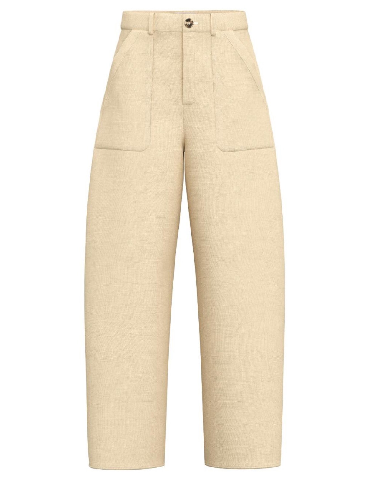 Washed pure linen trousers. Wide leg. Exposed button closure. Front patch pockets with visible stitching. Forward leg.