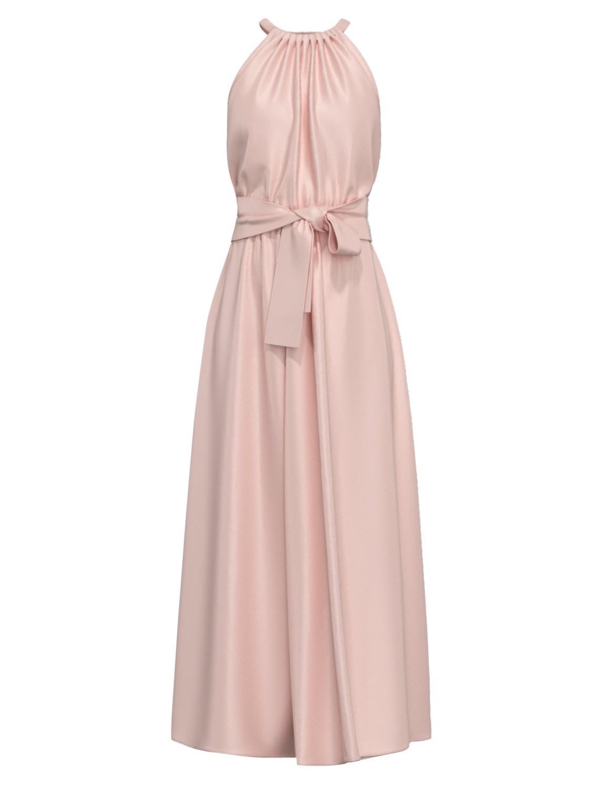 Technical satin dress. Semi-fitted fit. Halter neck with gathered detail. Wrap skirt with sash at the waist. Button closure at the back of the neck.