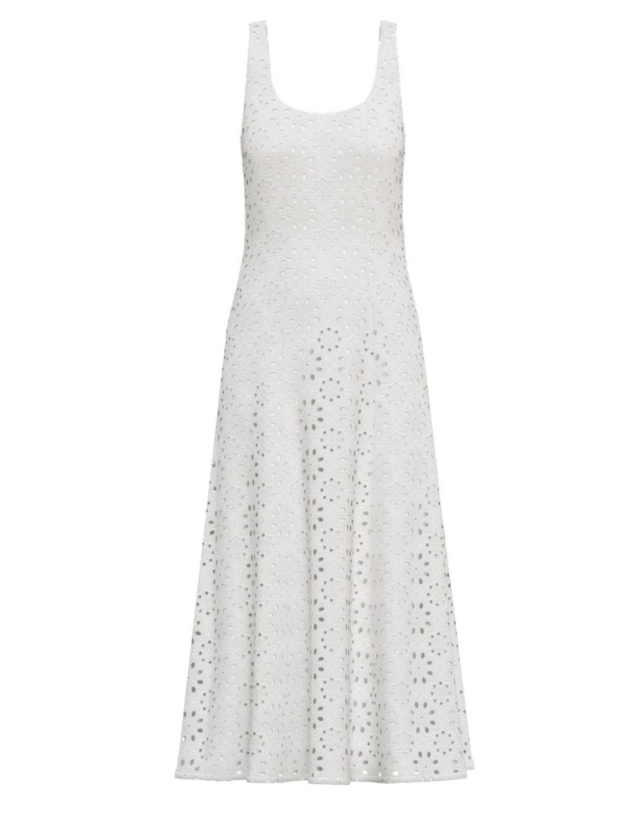 The elegance of simplicity: a new fit-and-flare dress in pure cotton muslin with all-over broderie anglaise embroidery. The matching lining protects against see-through and adds a feminine allure.
