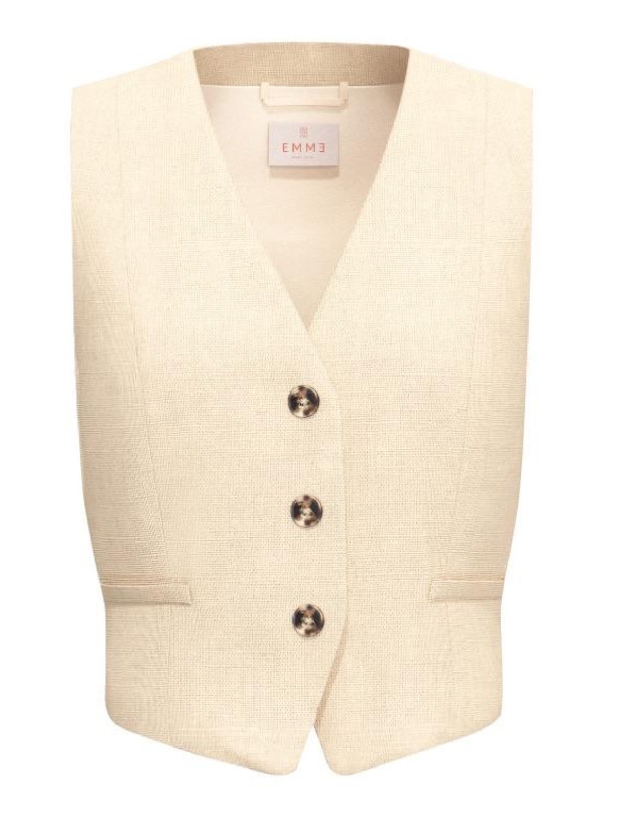 Pure linen canvas vest with internal lining. Fitted fit. V-neck and exposed buttons. Front welt pockets. Shaped sides.