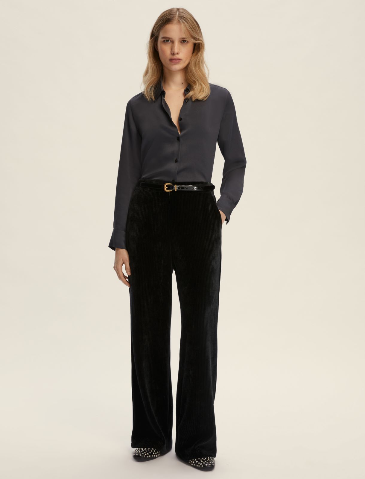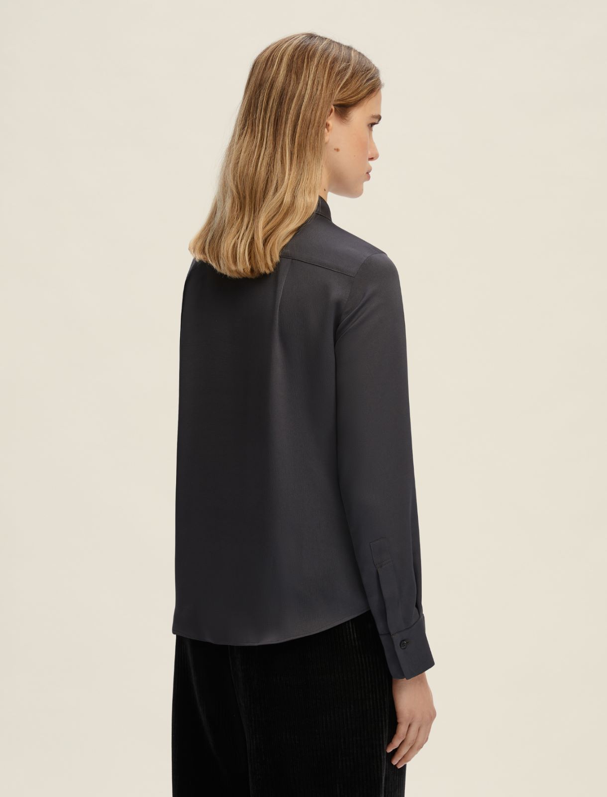 A classic revisited with contemporary lightness, the hammered satin shirt combines the fluid sheen of the fabric with a clean line. The rounded hem and semi-fitted fit make it ideal both under a blazer and worn next to the skin, with natural ease.