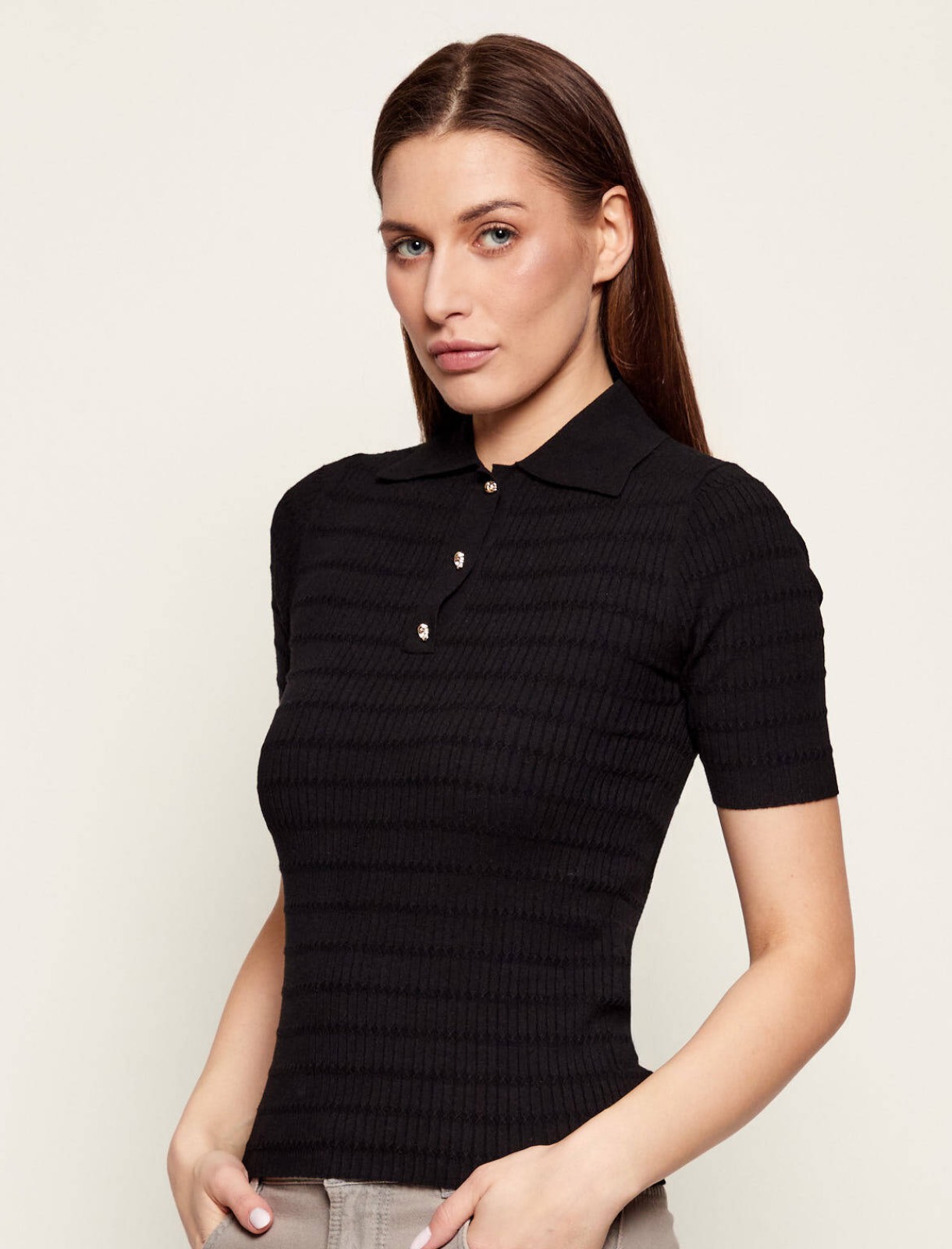 Knitted viscose blend polo shirt. Feminine fit. Polo collar with three jeweled buttons. Short sleeves. Cable knit detail.