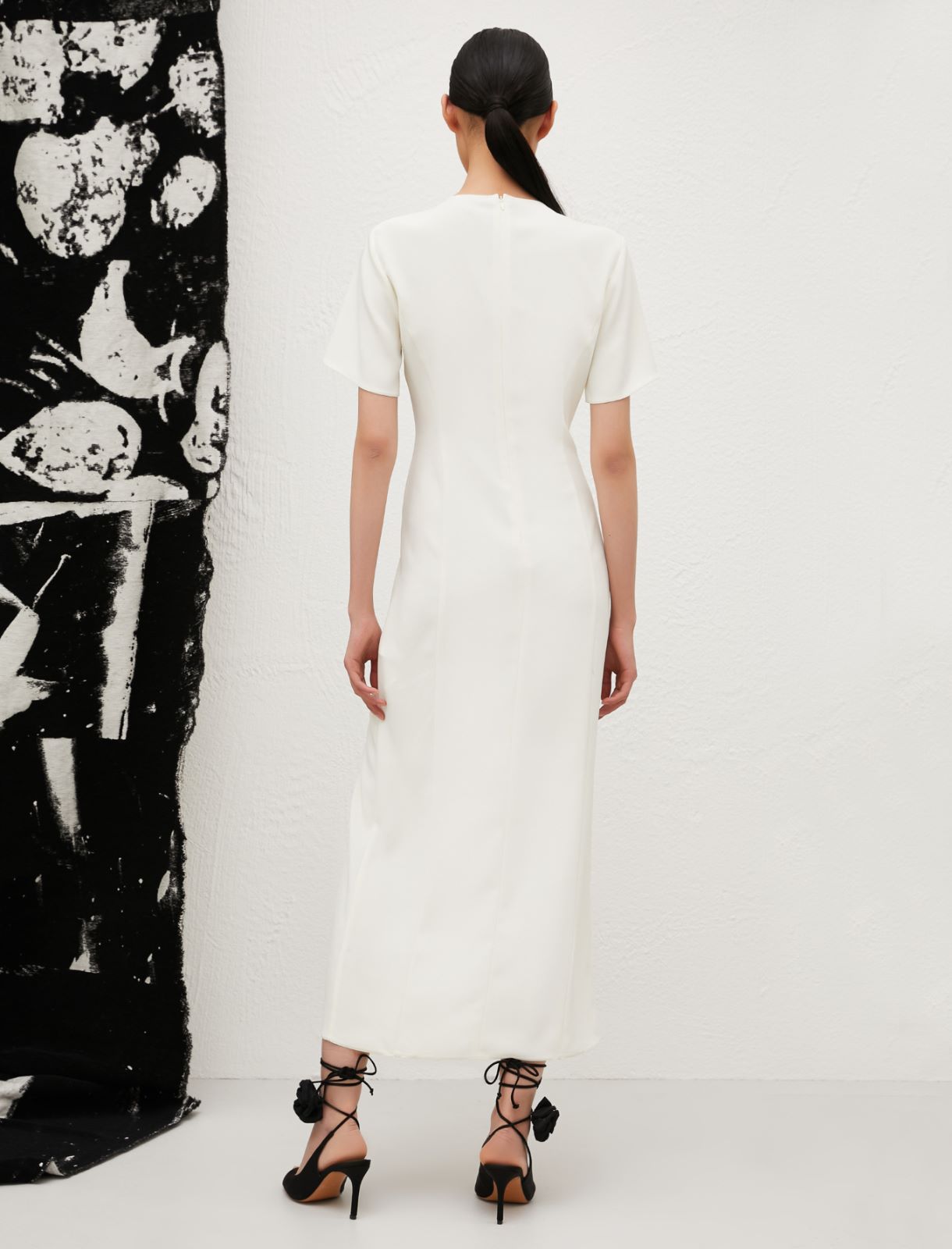 Semi-fitted line with asymmetrical slit on the front. Round neckline, short sleeves. Invisible zip closure on the back. Unlined model.