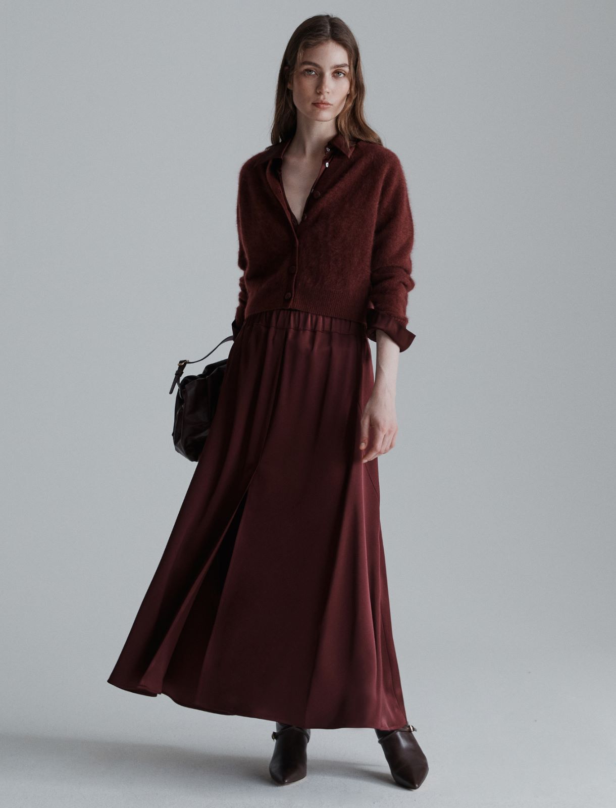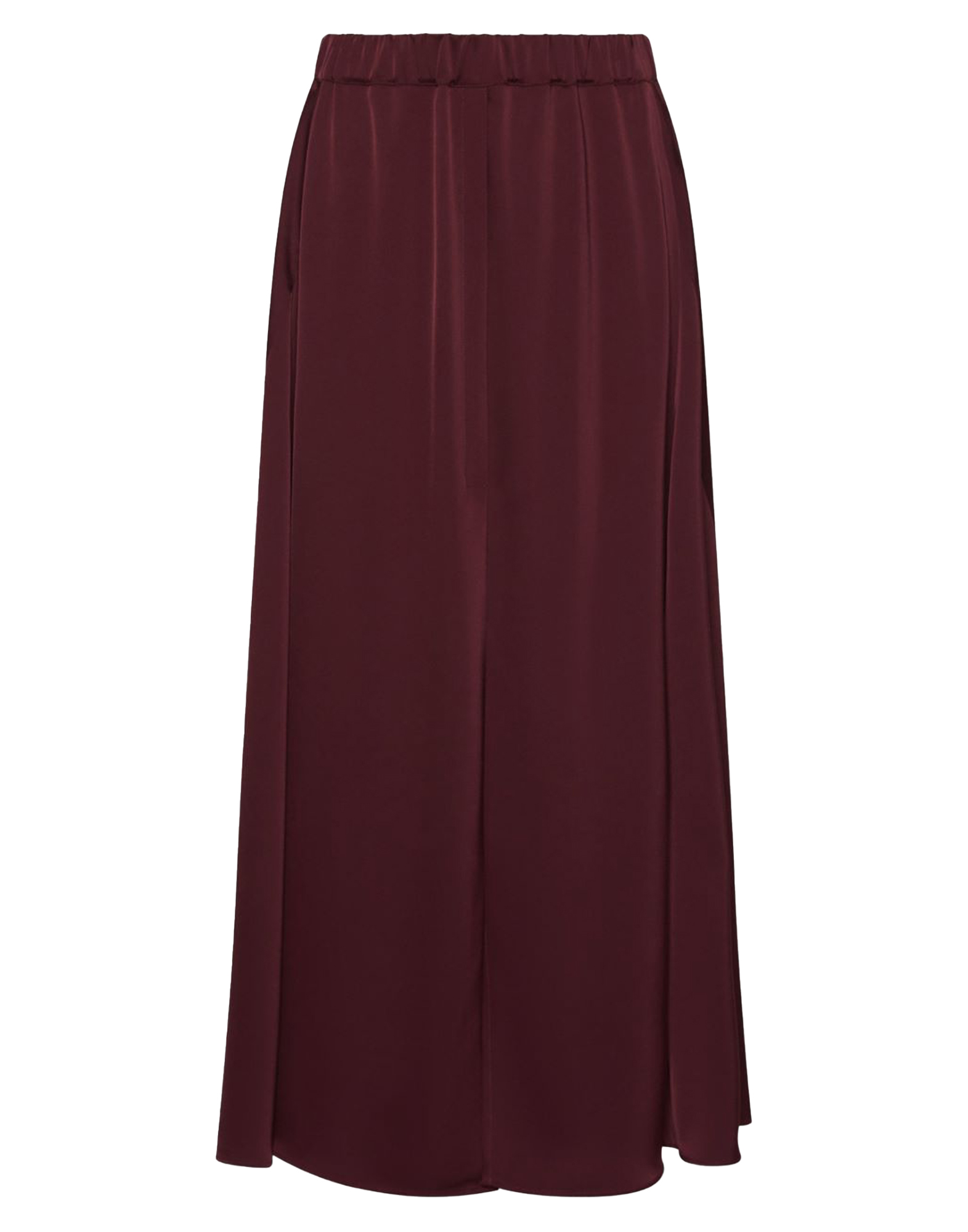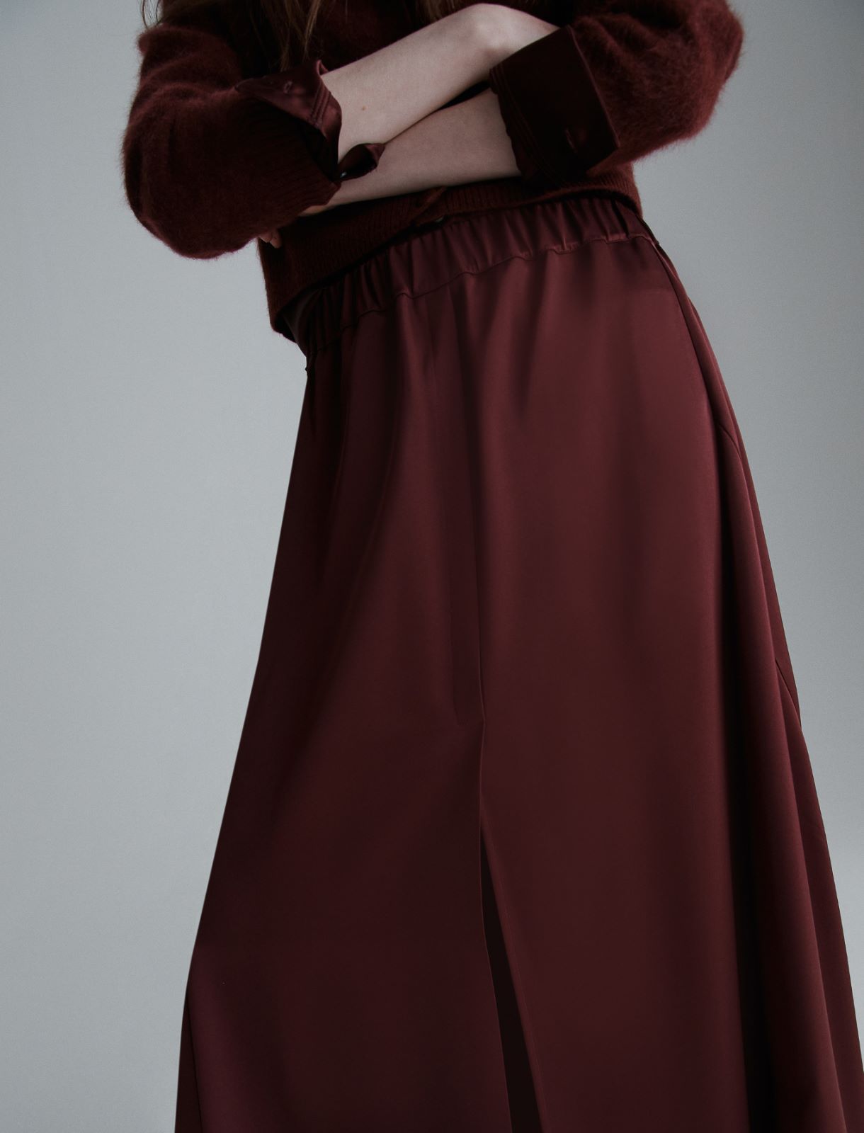 Satin skirt. Flared fit. Elasticated waist. Embroidery detail on the front