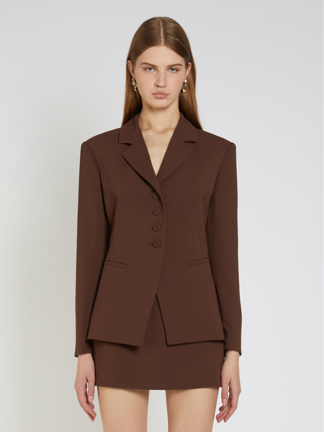 This crepe blazer caresses the silhouette and creates a new femininity. The glossy touch on the lapel and the covered buttons suggest a refined interplay of details, for a look that never fails. Satin-backed crepe blazer with satin lining. Fitted fit. Lapel collar. Single-breasted closure with exposed covered buttons. Shaped darts and side panels.