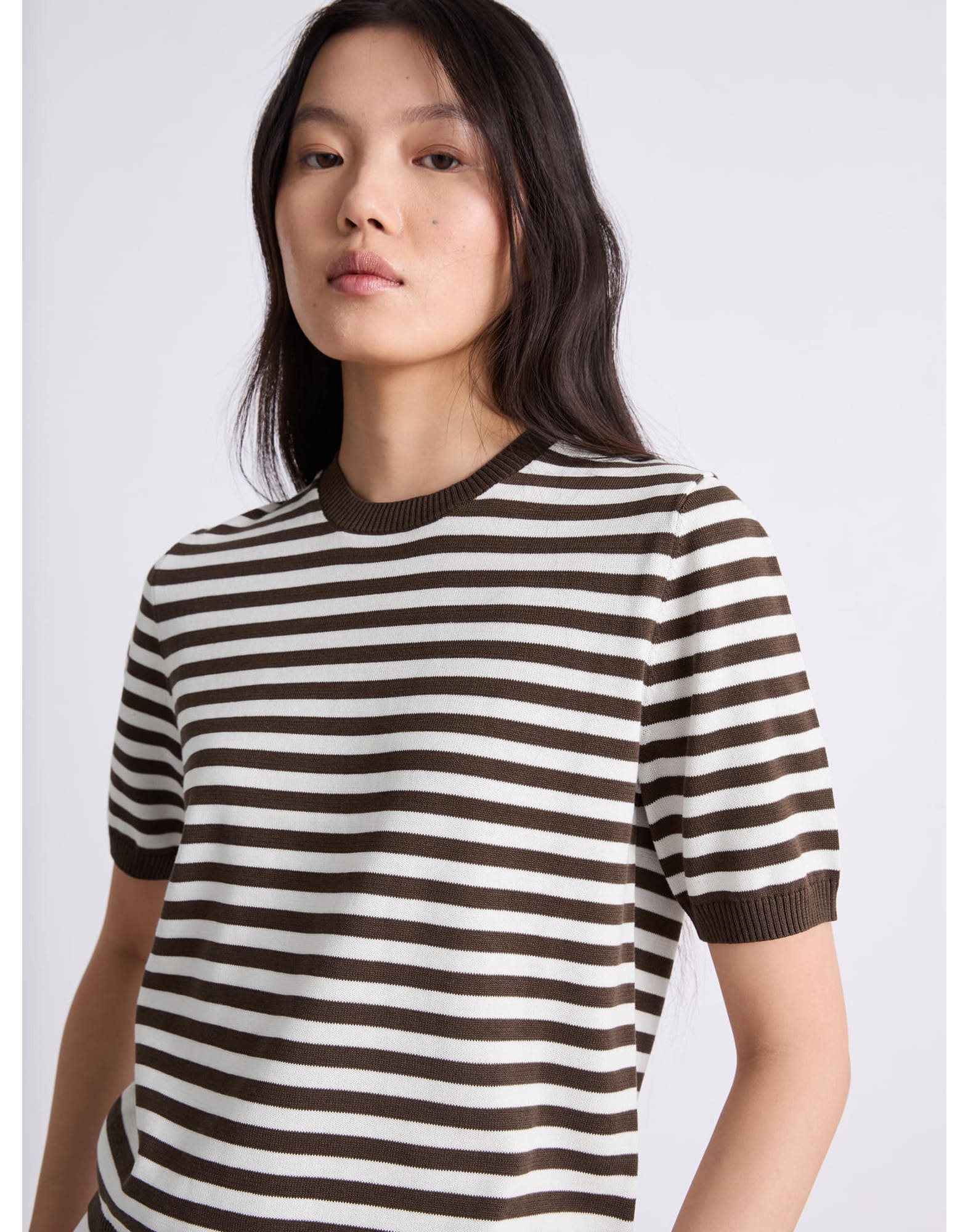 Cotton-silk yarn sweater with a tight fit, round neck, elbow-length set-in sleeves, ribbed neckline, cuffs and hem.