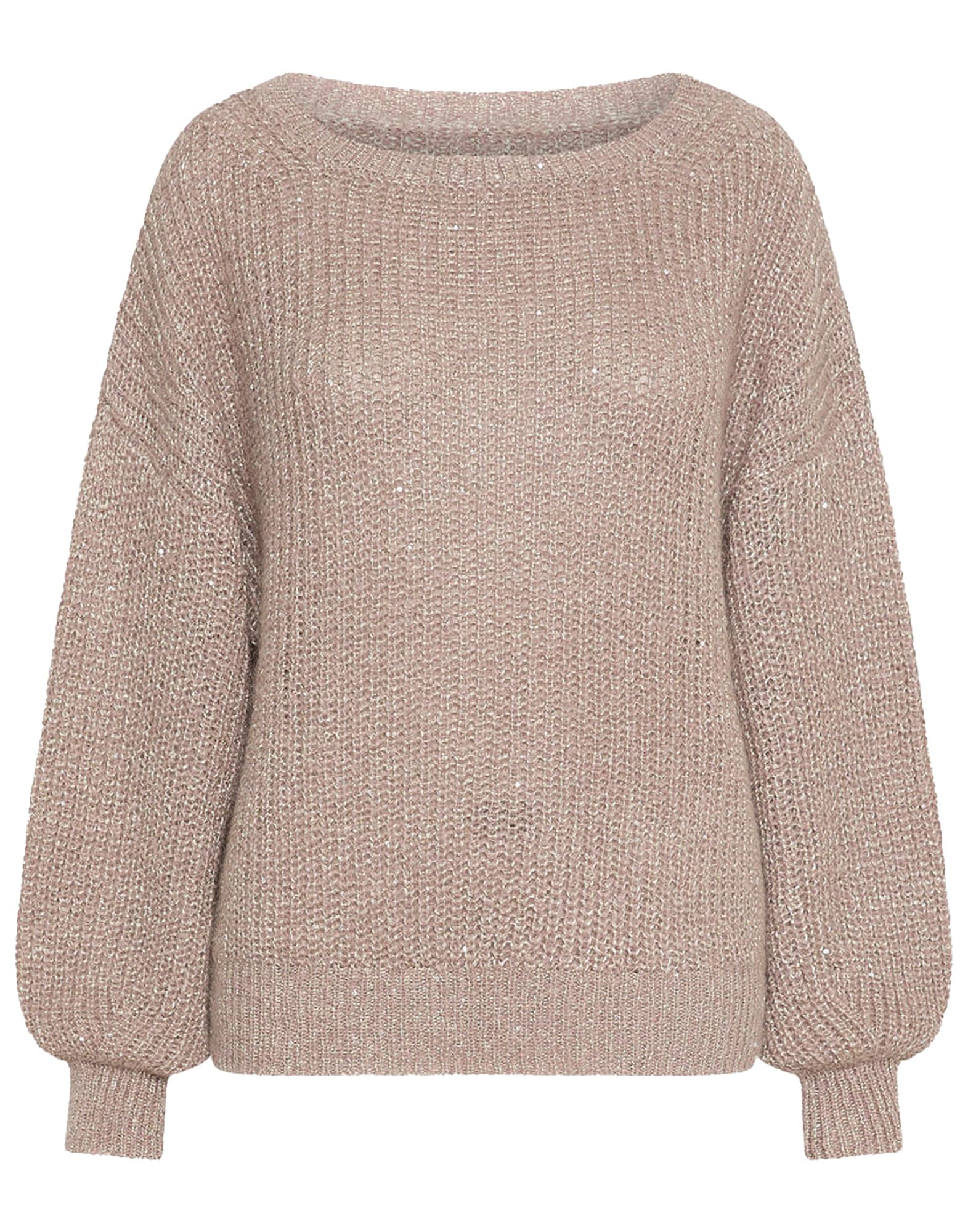 Kid-mohair blend sweater with microsequins, relaxed fit, round neckline, long sleeves with dropped shoulders and wide cuffs with ribbed cuffs. 1x1 rib trim, gauge 7, corncob stitch.