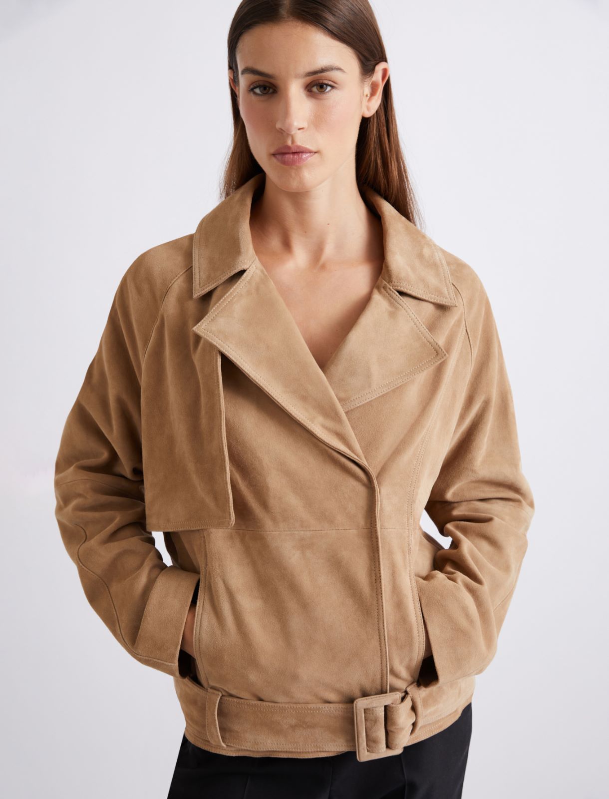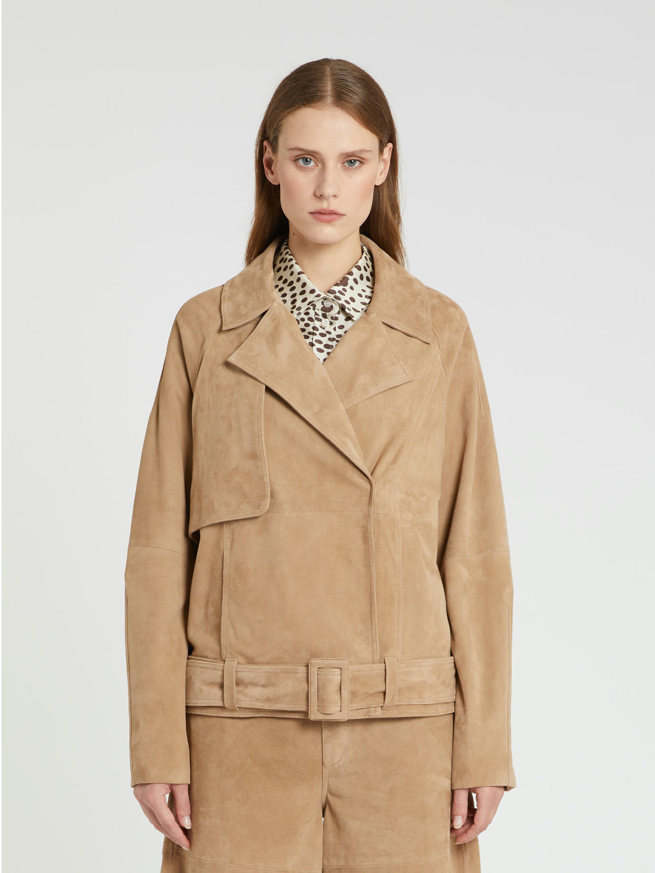 Suede jacket with lapel collar, regular fit, raglan sleeves; hidden snap button fastening; lined with inset pockets on the front sides; belted.