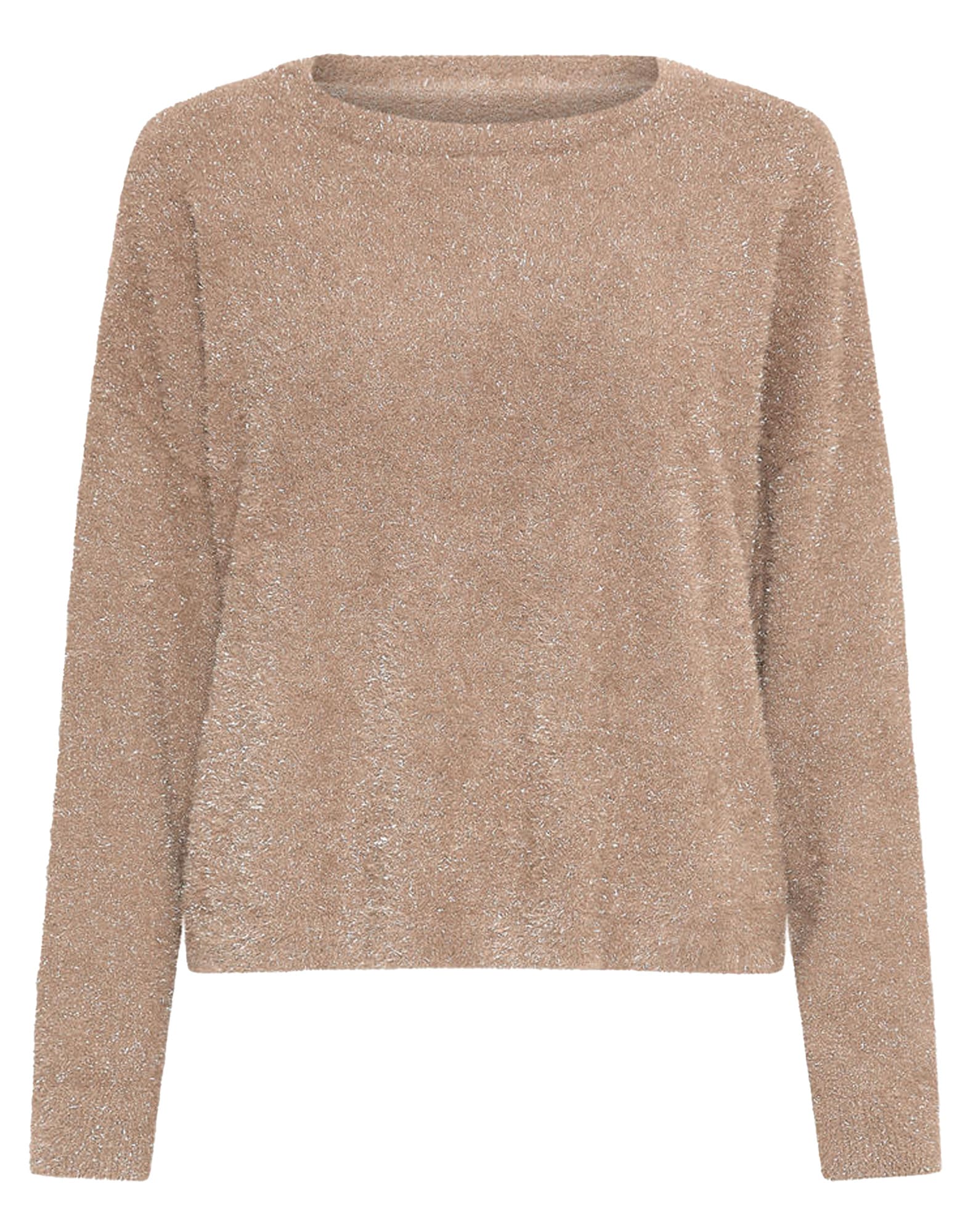 Fur-knit sweater, straight fit, slightly boat neckline, long sleeves with dropped shoulders, 1x1 rib trim, gauge 7, plain weave.