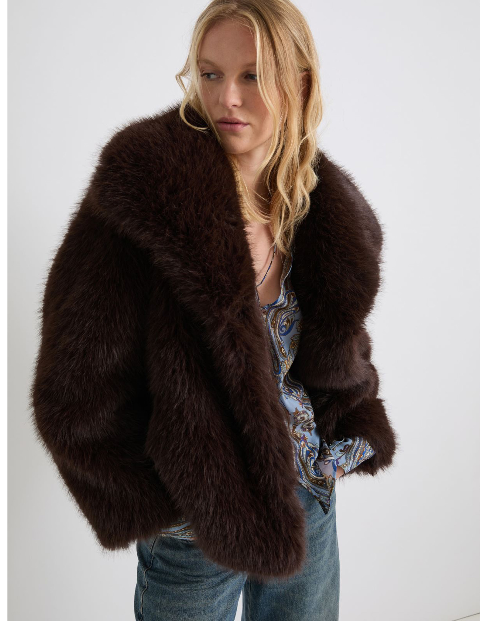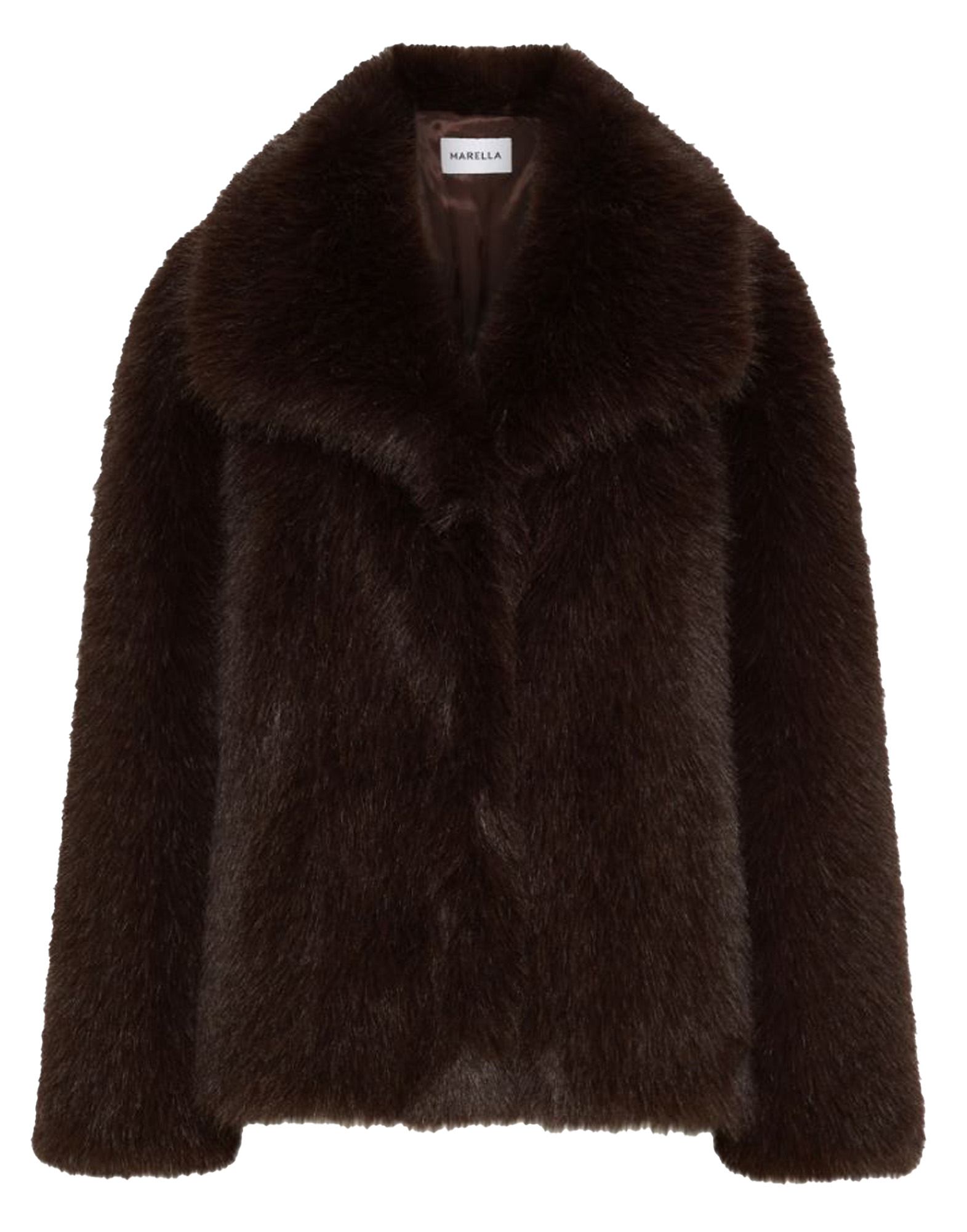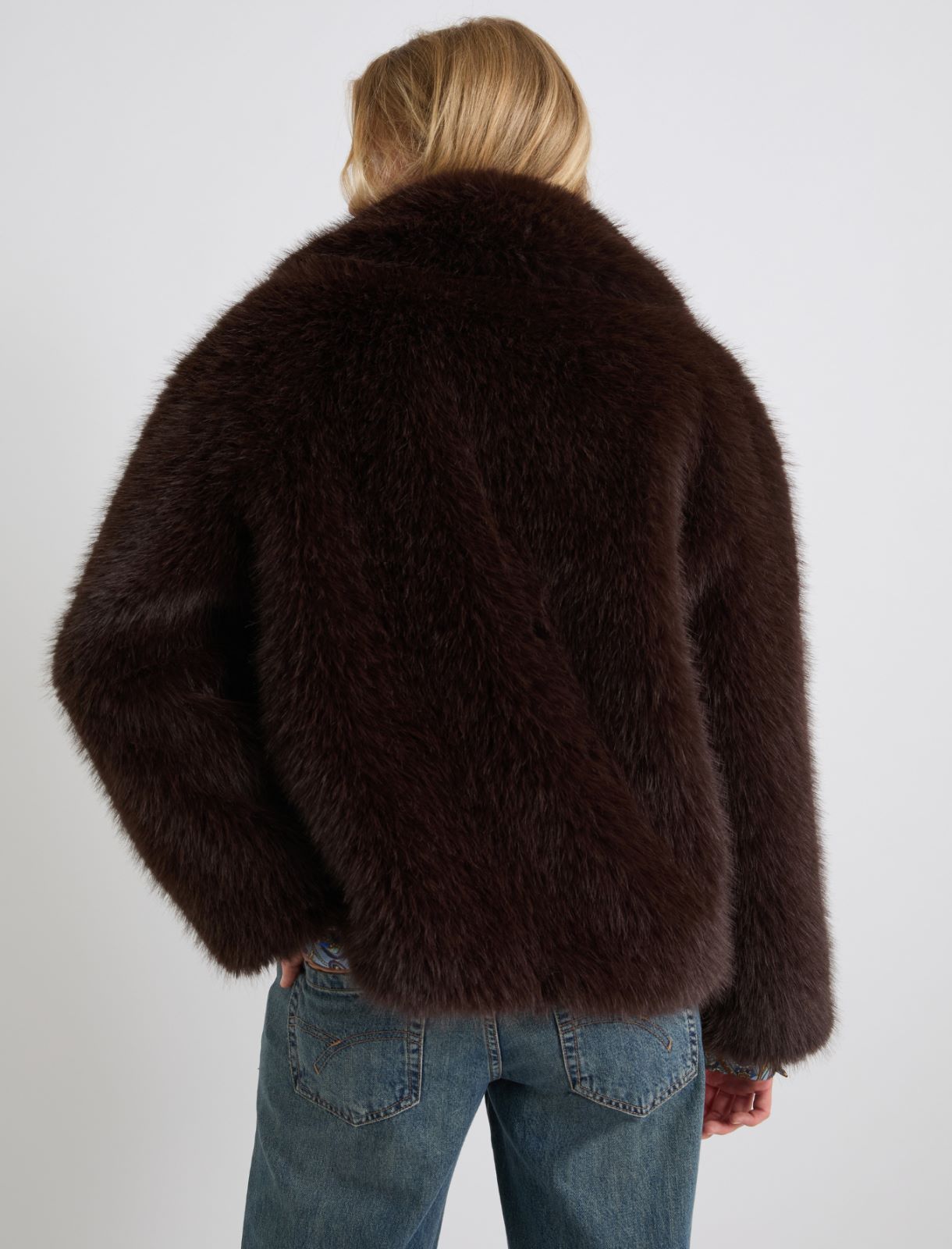 Faux fur jacket with a wide neckline, oversized volume and a straight fit, long raglan sleeves, concealed metal snap button closure on the right side, and fur-lined front pockets. Lined.
