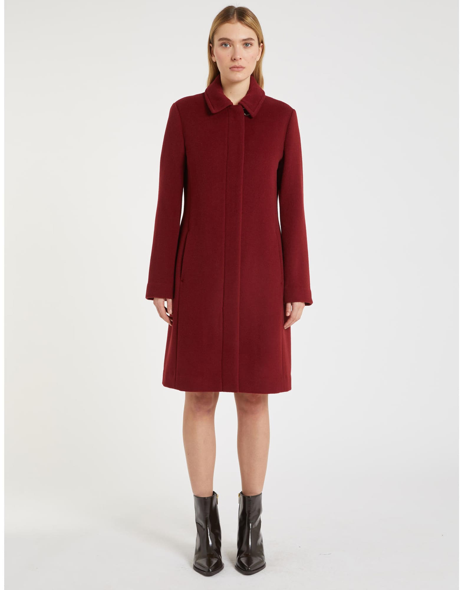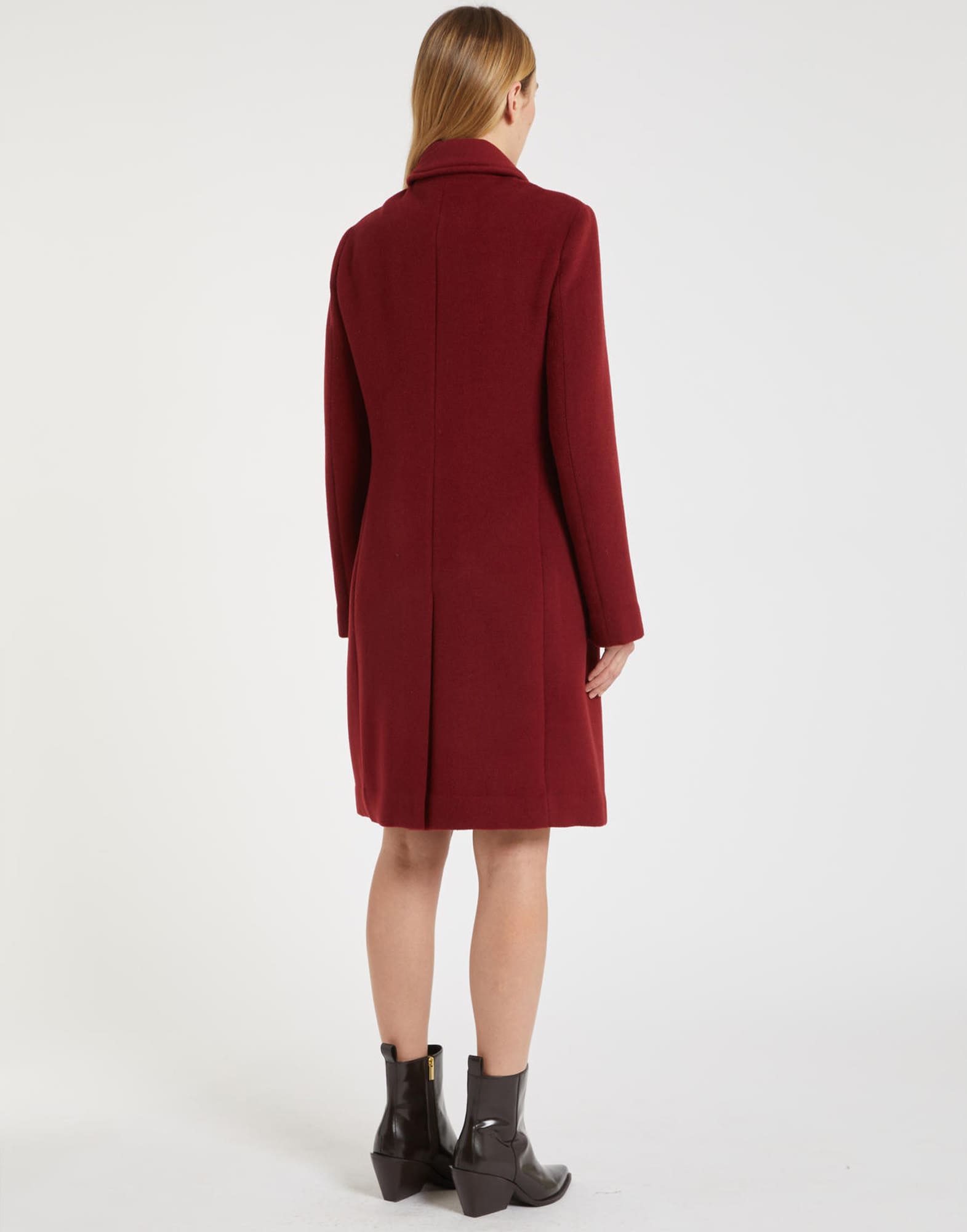 Simple and urban, this double-faced coat plays with clean lines to give you impeccable outfits every time. Fitted for a defined silhouette. Double-faced pure virgin wool coat. Fitted fit with shaped sides. Shirt collar with hidden two-way zip. Hook and eye detail. Lined. Color: Burgundy