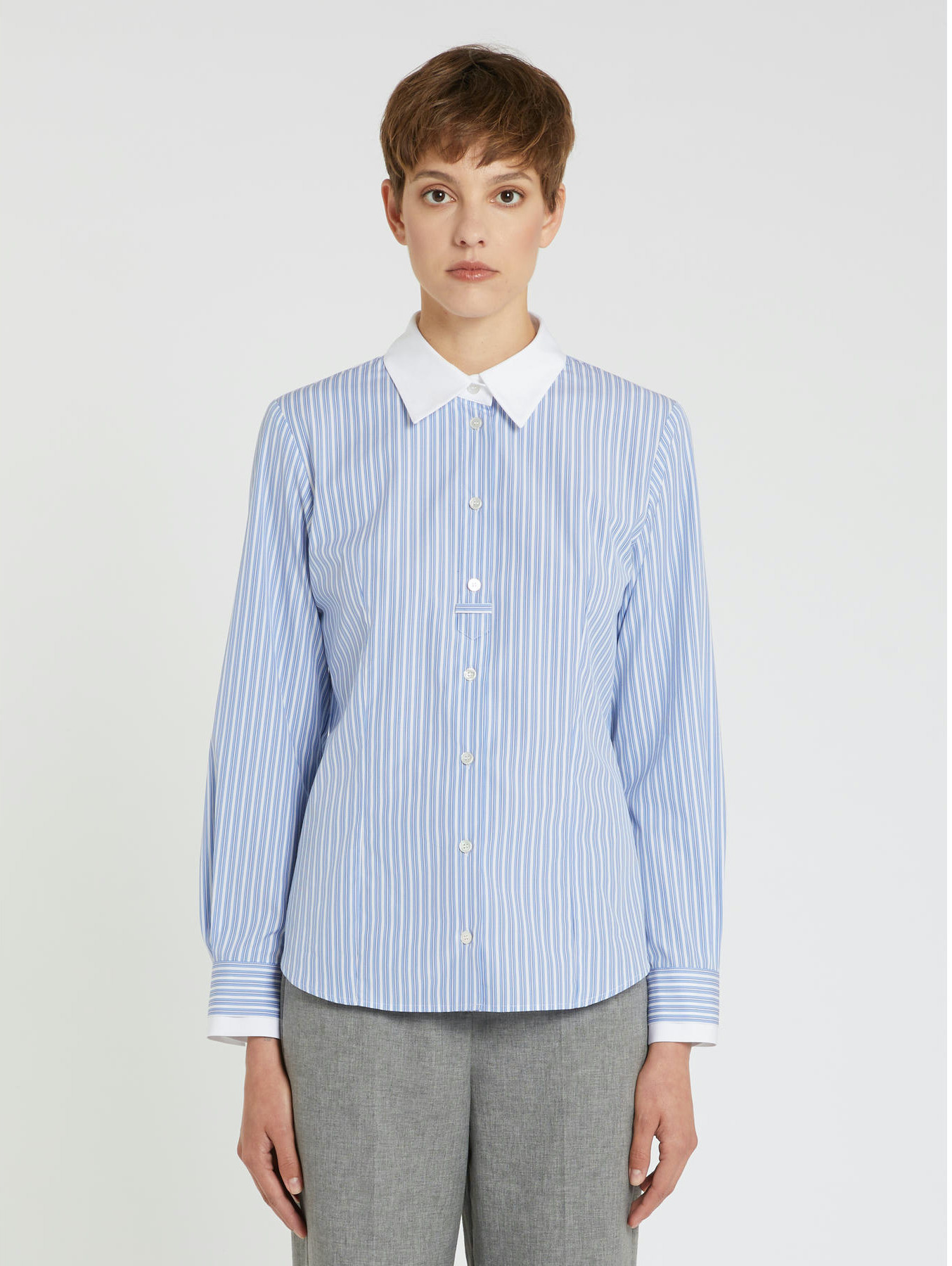 Pure cotton poplin shirt. Fitted fit. Contrasting shirt collar. Exposed button placket. Rounded hem and back yoke with embroidered flower.