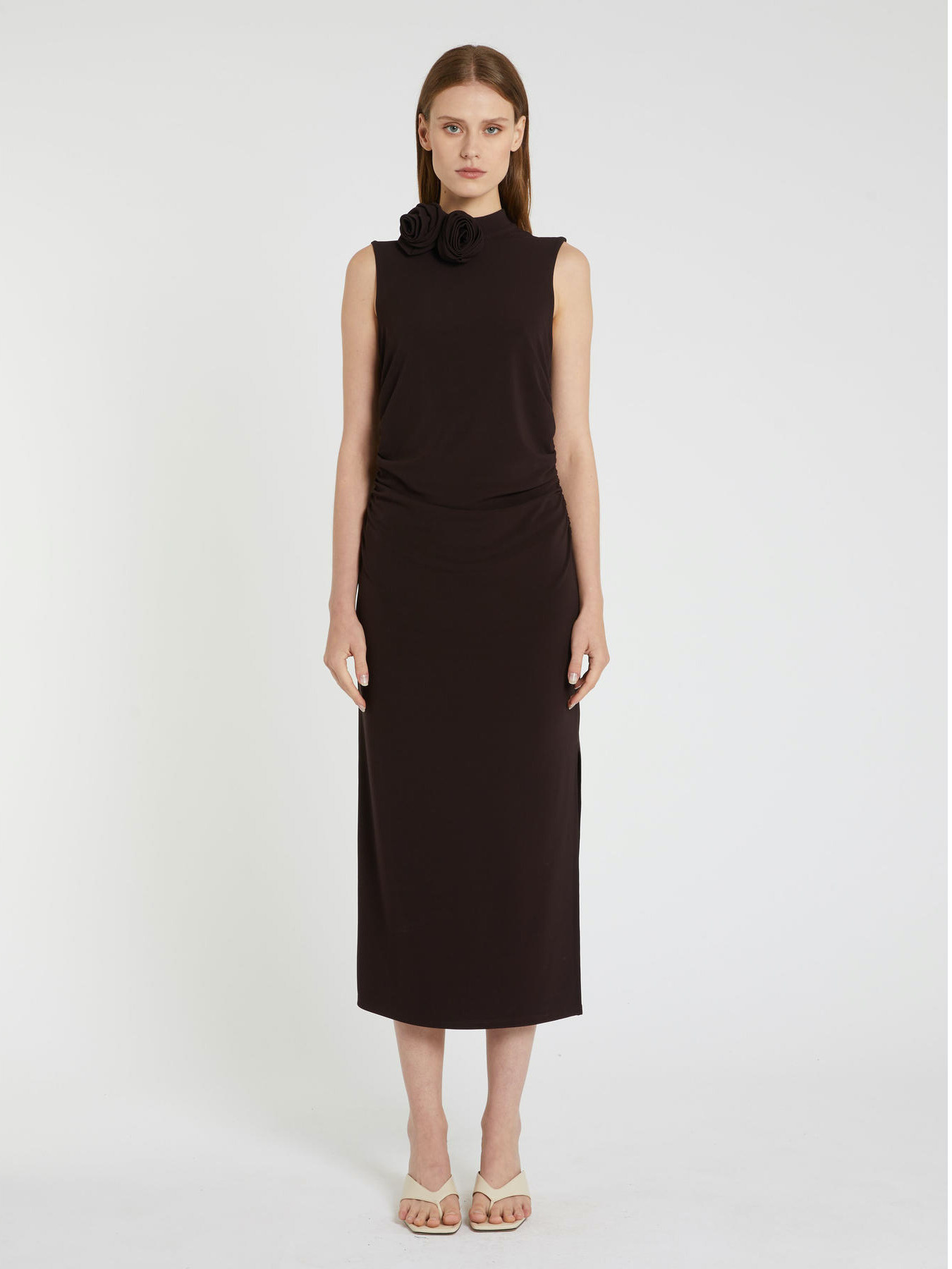 Stretch viscose jersey dress lined with tulle. Feminine fit. Funnel neckline. Gathered detailing at the sides and waist. Flower brooches.