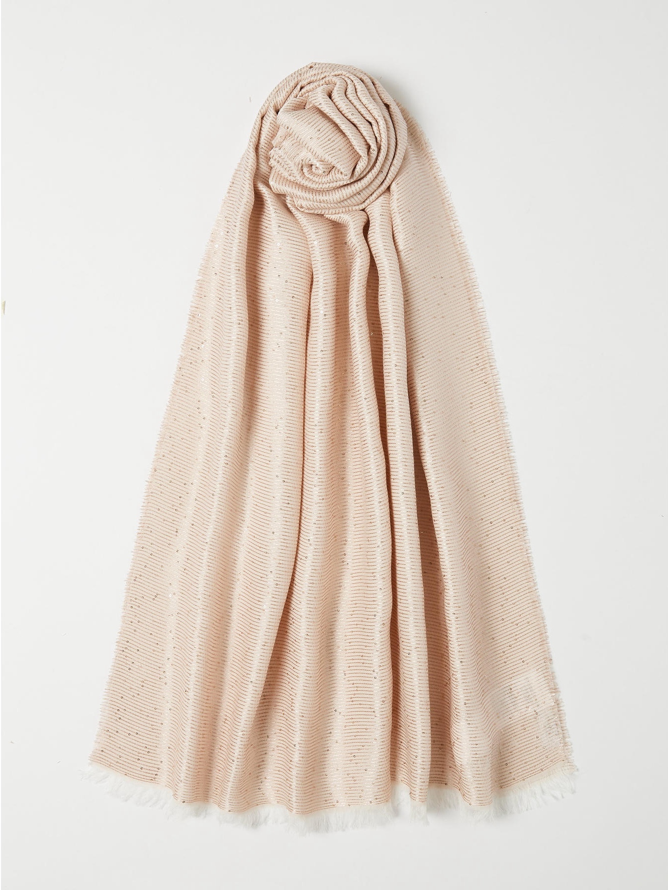Modal and viscose stole with micro sequins, measuring 73x180 cm, fringed on all four sides. Marella jacquard logo on the short side.