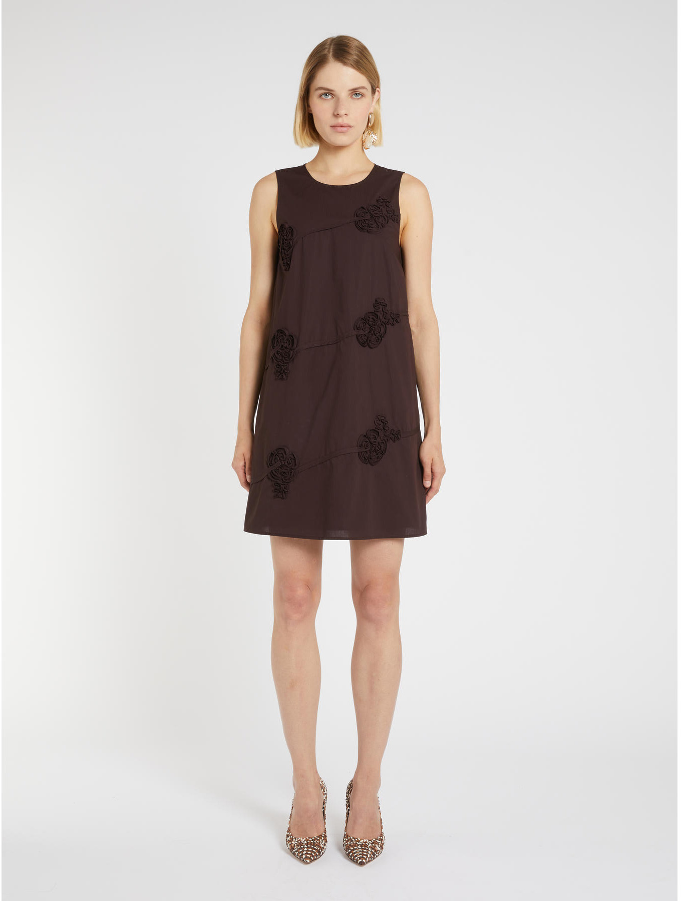 Embroidered cotton poplin dress. Flared fit. Round neckline with keyhole and back button. Sleeveless. Lined.