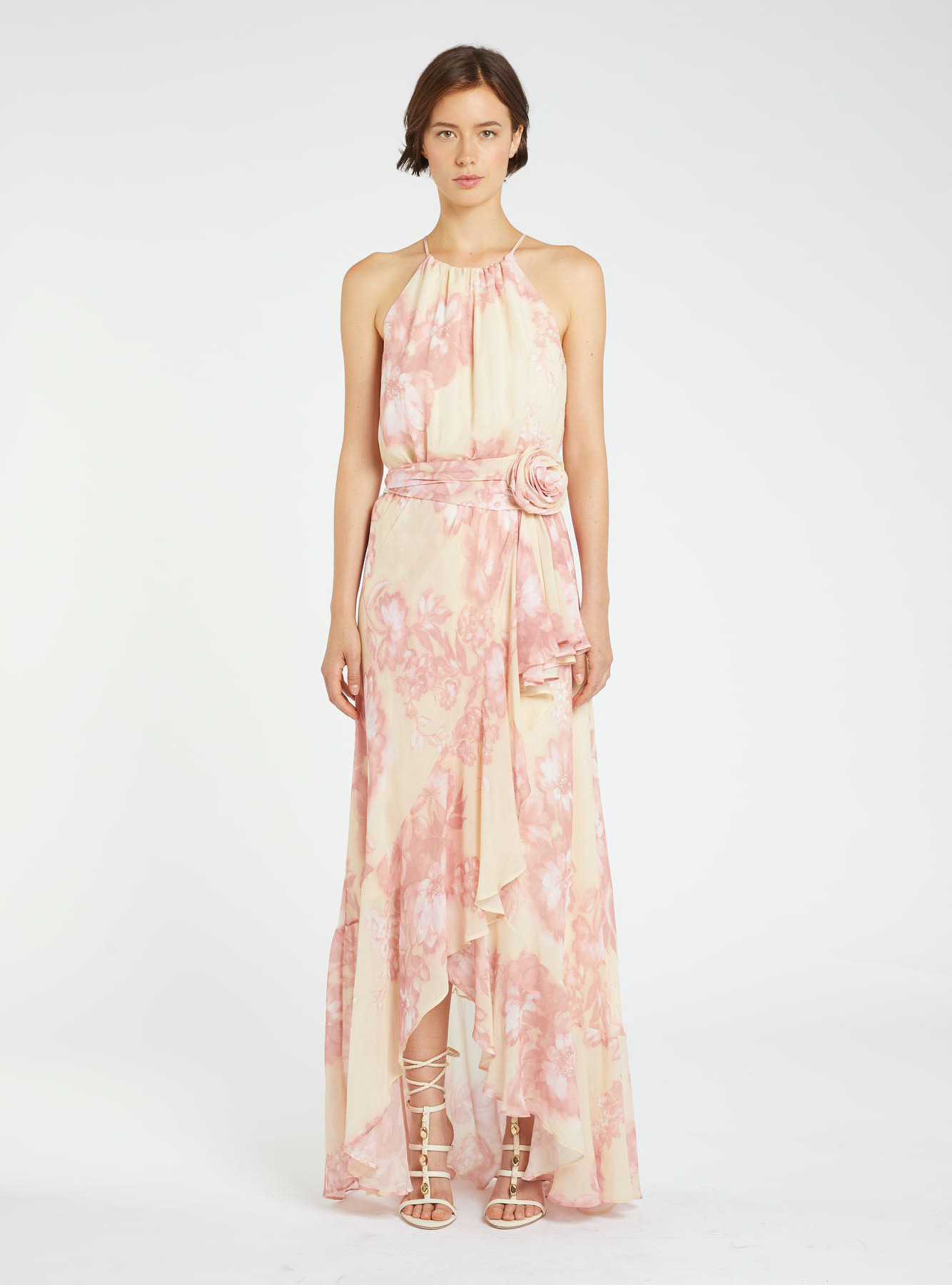 Viscose georgette dress with crepe de chine lining. Feminine fit. Halter neckline with light gathering and keyhole back. Fitted waist and maxi diagonal ruffle on the skirt. Fabric belt with maxi rose.