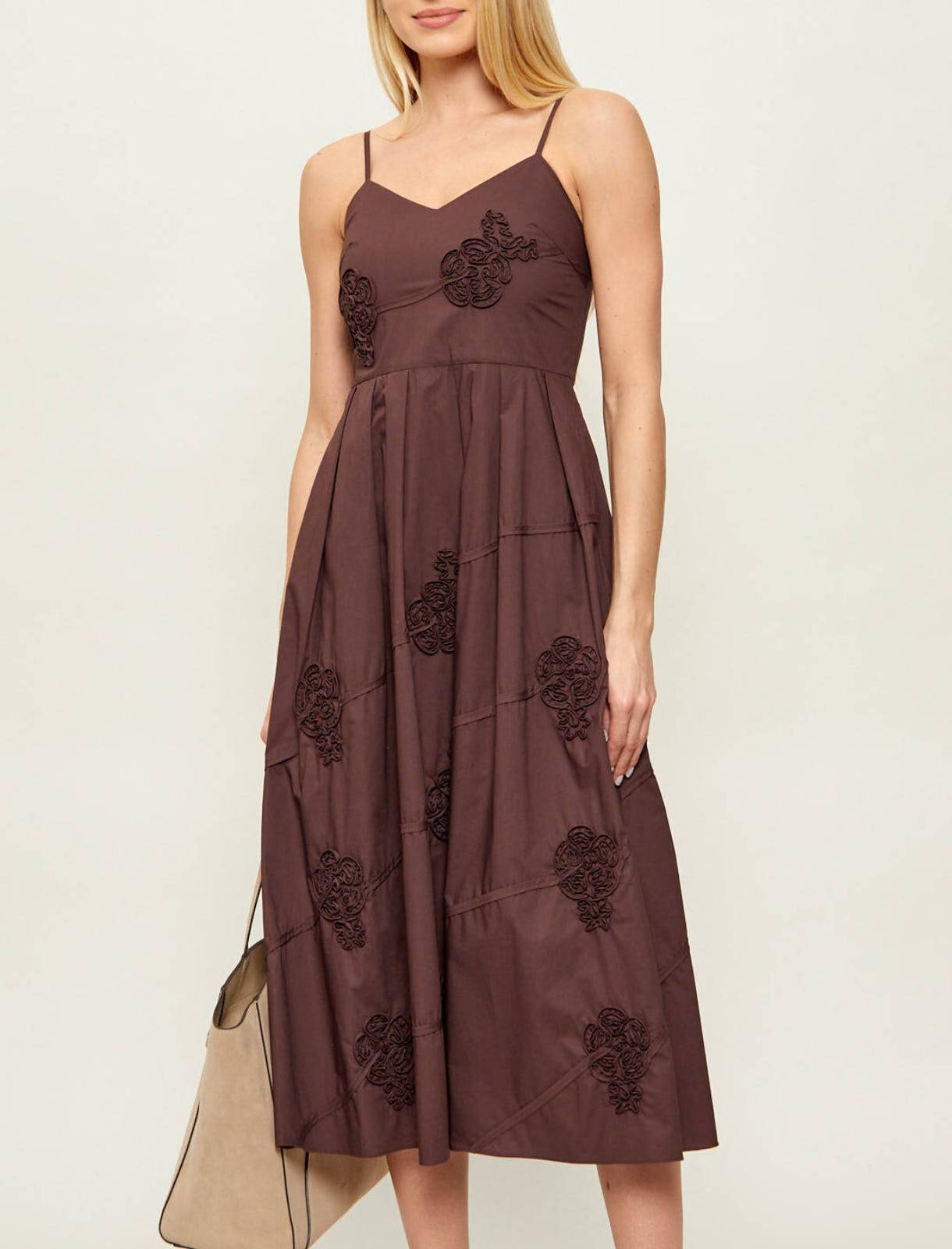 The perfect summer look is a one-piece: this poplin dress with an embroidered bodice and flowing skirt. Visible shoulders and a cleavage, this dress offers a decidedly feminine silhouette. Embroidered and lined cotton poplin dress. Regular fit. V-neck with thin shoulder straps. Fitted waist and full skirt with inset side pockets. Appliqué fabric embroidery with a three-dimensional effect. Invisible zip on the left side.