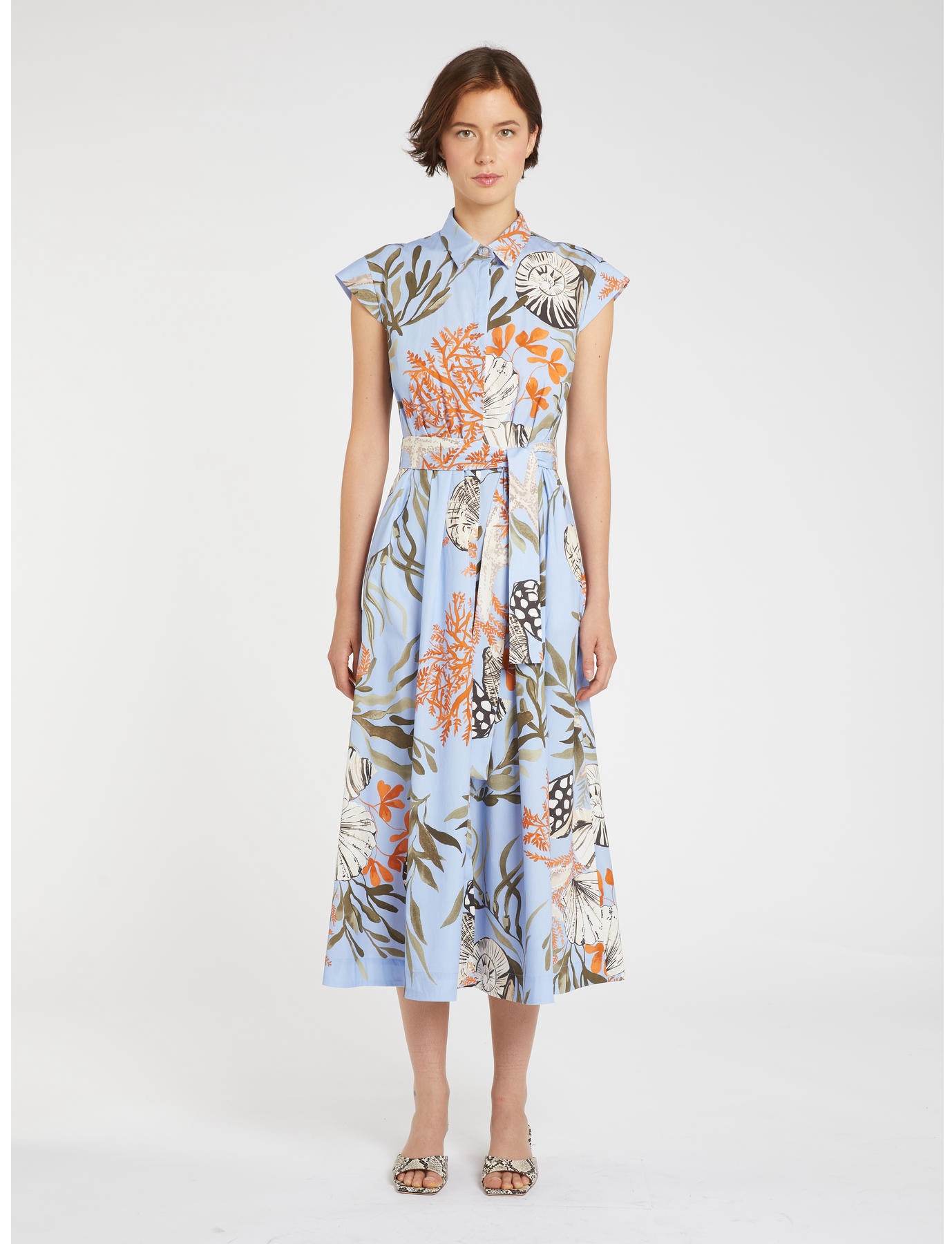 Stretch cotton poplin dress. Regular fit. Shirt collar with hidden buttoning. Dropped shoulders and cap sleeves. A-line skirt with pleats and a fabric belt.