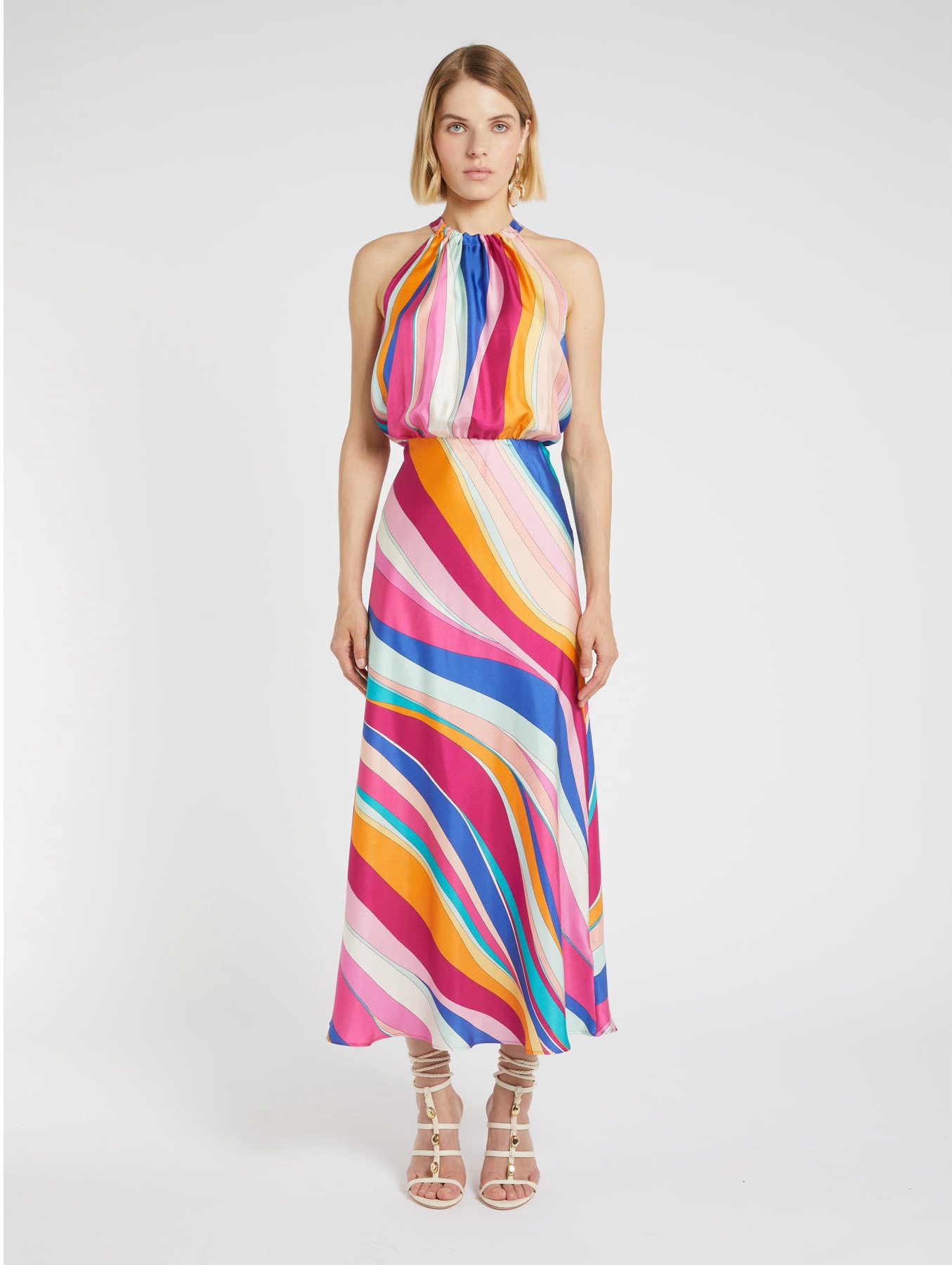 Designed for social occasions, this silk dress leaves the shoulders and back exposed, playing with fluidity and draping. Complete the print's color palette with towering sandals and bejeweled earrings.