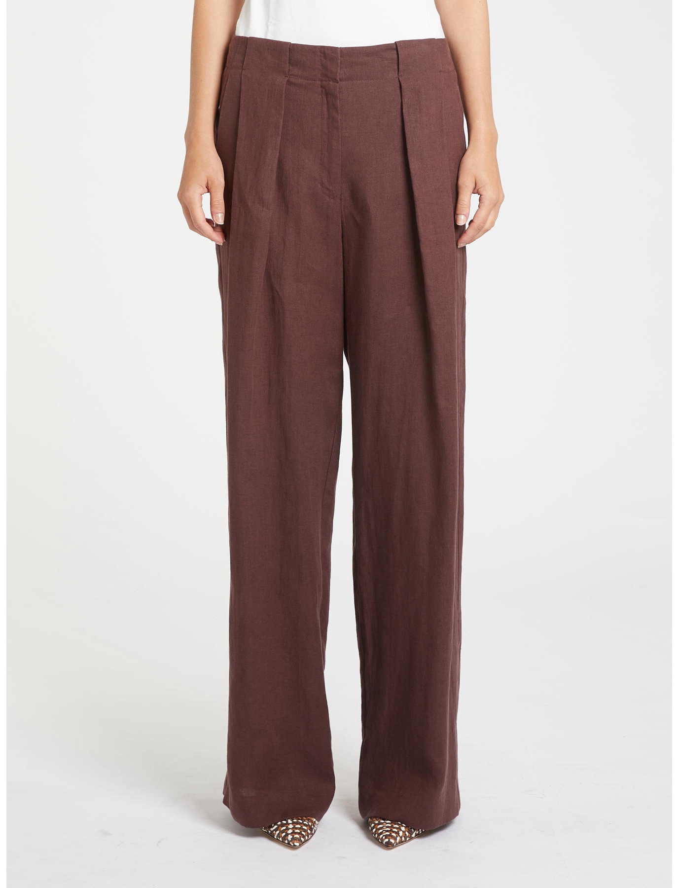 Soft linen, double waist pleats, and details inspired by men's styles: these new trousers embrace formal elegance while maintaining their summery appeal. Perfect with sleeveless tops or lightweight shirts.