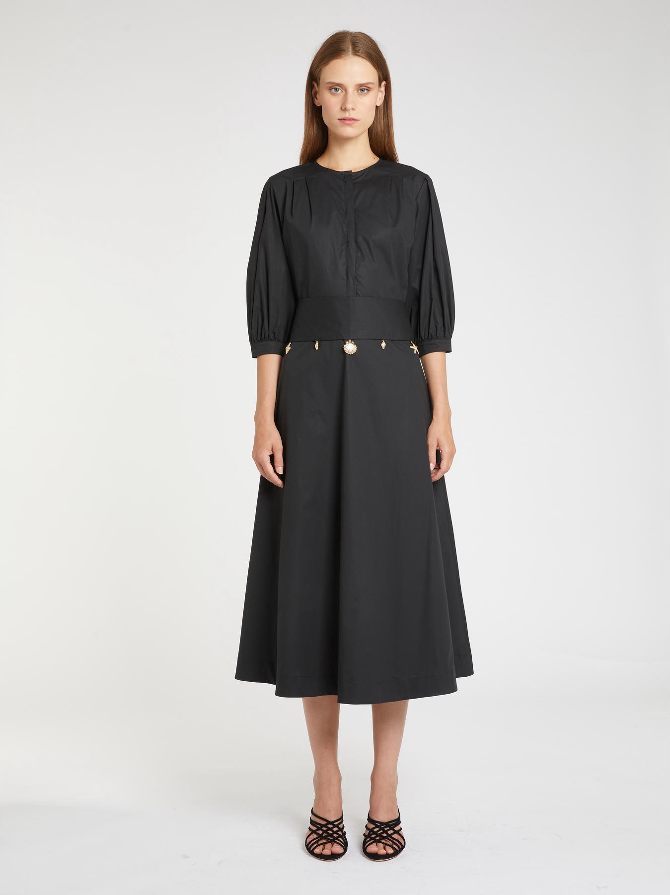 Stretch cotton poplin dress. Regular fit with flared skirt. Round neck with hidden button placket. Three-quarter sleeves with gathered detailing. Fabric belt.