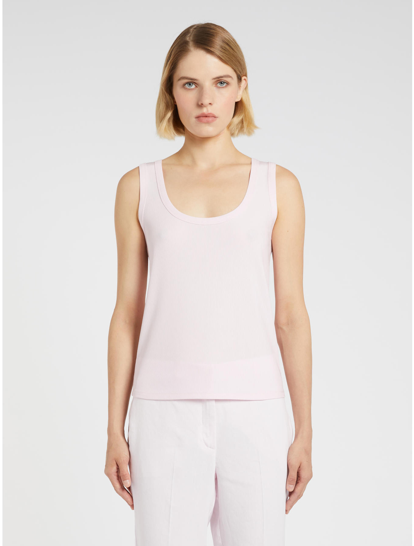 The summeriest basic ever, in a stretch version: a new tank top in shiny viscose jersey, flowing on the body and radiant in the sun. Choose it in warm-weather shades for a super versatile mix and match. Stretch viscose jersey tank top. Fitted fit. Round neckline. Logo ring detail on the back. Marella monochrome.