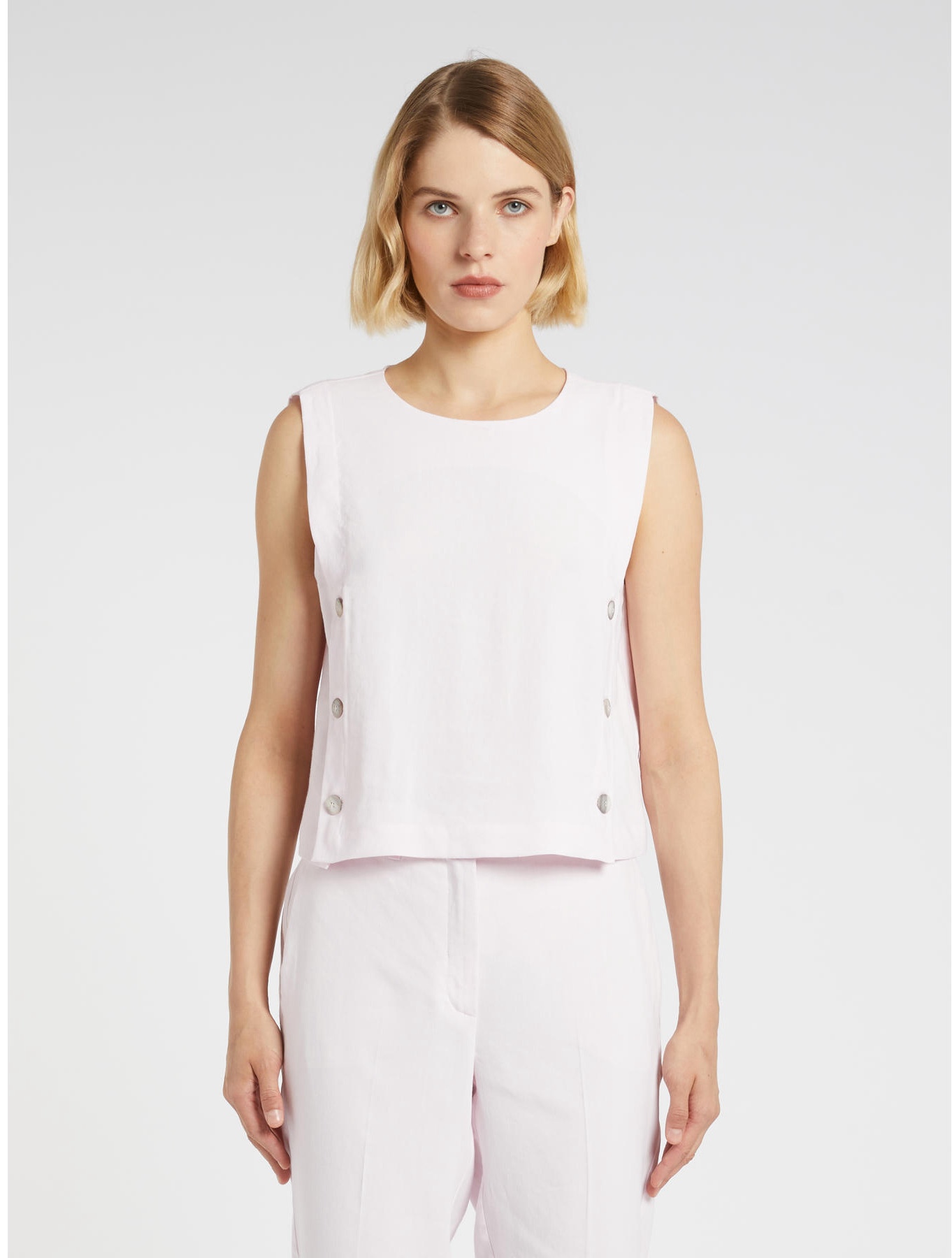 Warm weather arrives like a light breeze, perfect for this linen and viscose top. The exposed button detail along the sides adds a casual yet refined touch, reminiscent of polo or golf. Stretch linen and viscose top. Regular fit. Round neckline with keyhole and back button. Three-button fastening at the sides. Pleated detailing at the bust. Marella monochrome.