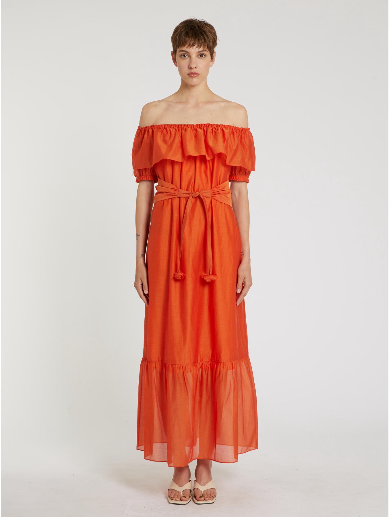 Organza cotton and silk voile dress with internal lining. Straight fit. Off-the-shoulder neckline with ruffle. Three-quarter-length raglan sleeves. Ruffled hem. Matching belt with textile flowers.