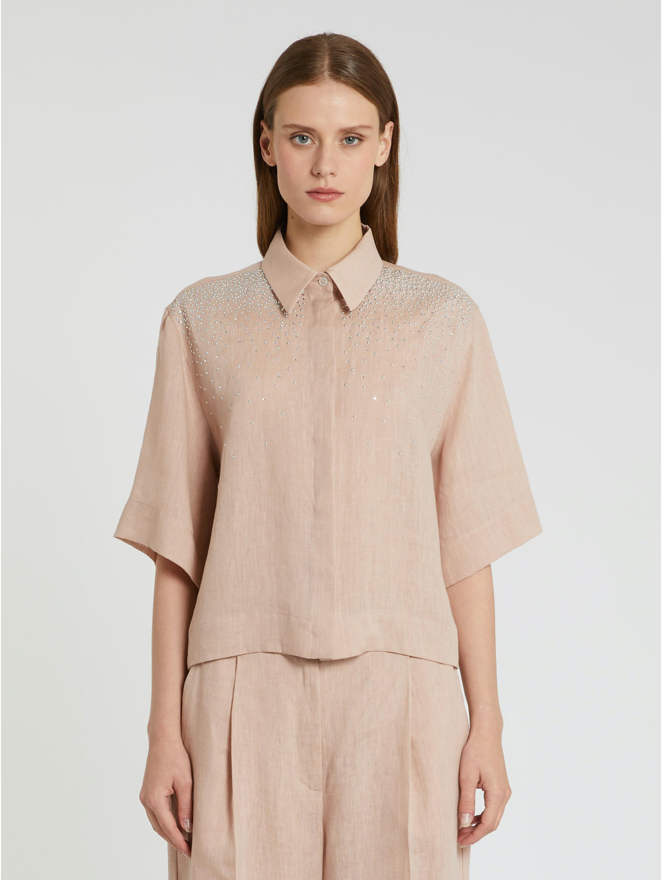 Pure linen shirt with rhinestones and rounded studs. Regular fit. Shirt collar. Hidden button placket. Short sleeves.