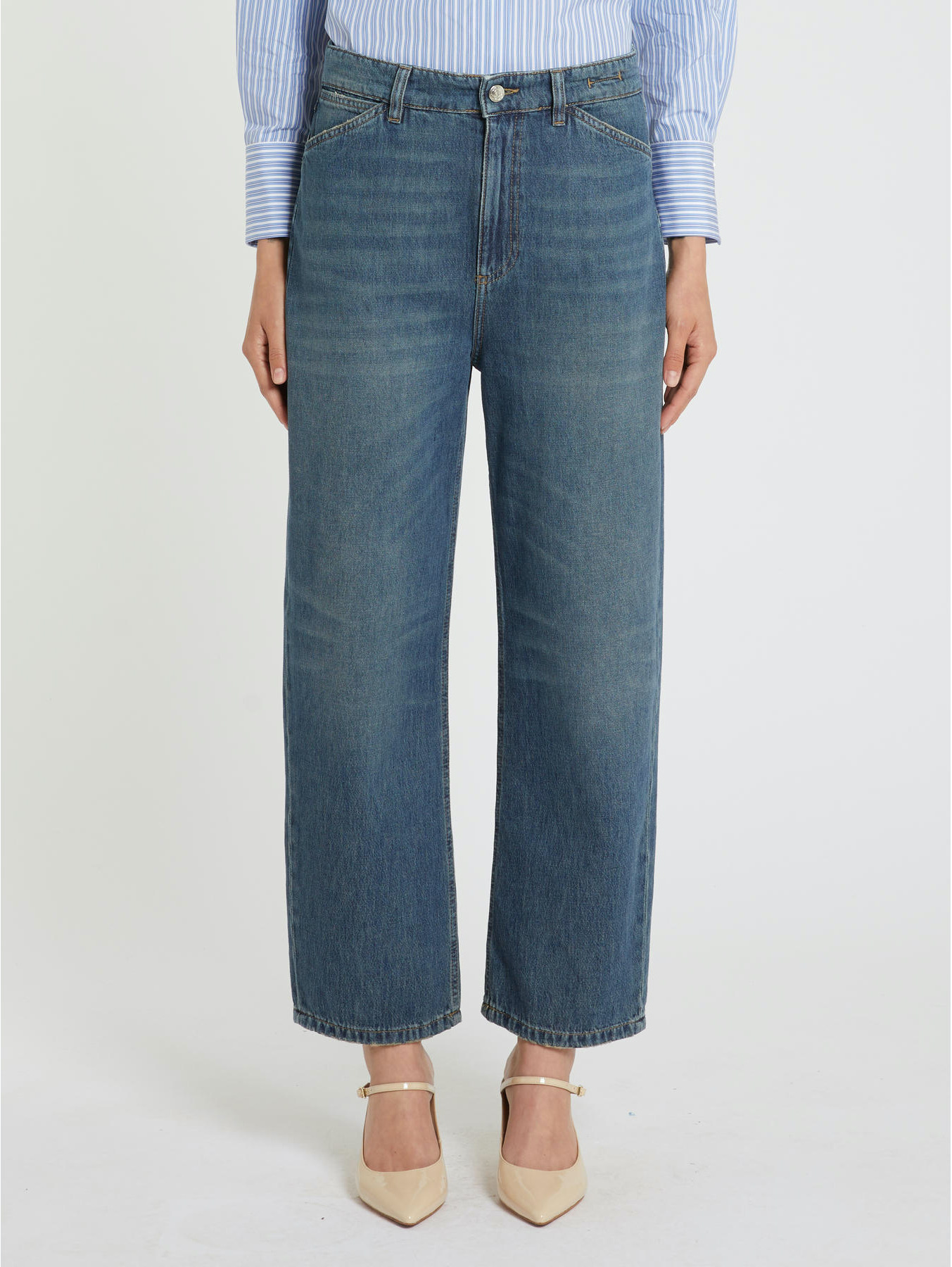 Denim jeans made in collaboration with Candiani Denim. High-waisted mom fit. 5-pocket construction with a custom button. Leather back label with logo. Fitted at the waist and hips, with a curved line on the legs.