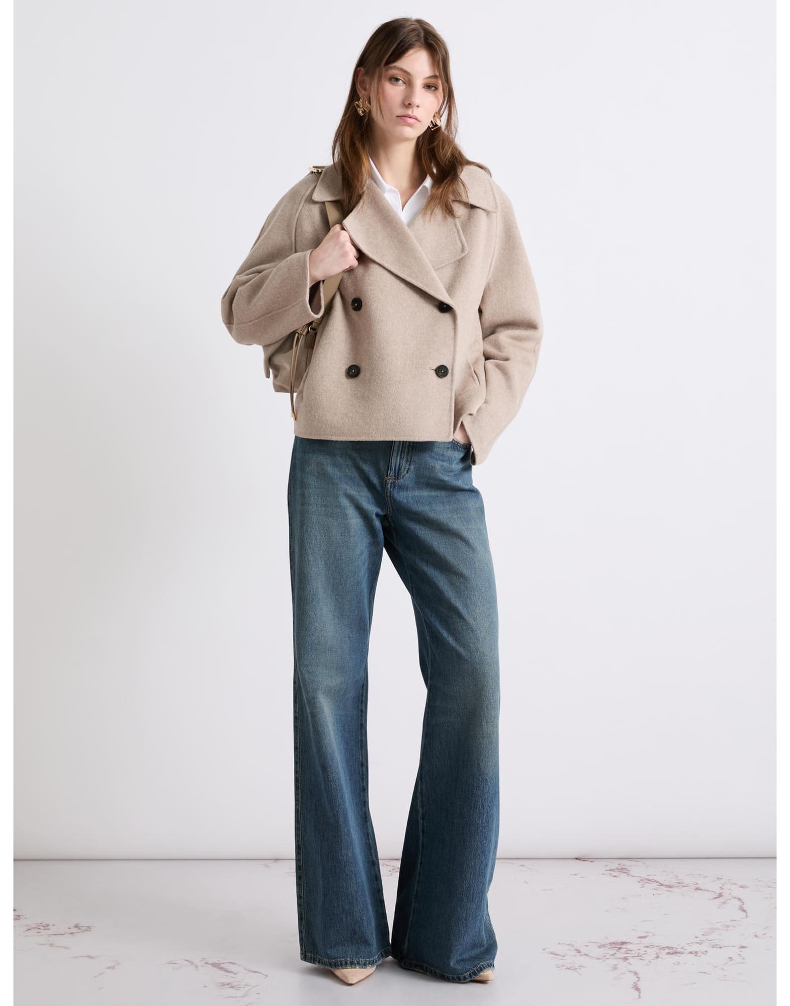Short, double-breasted trench coat in a double wool blend, long raglan sleeves, four-button front closure, single-welt pockets, unlined. Length: 58 cm