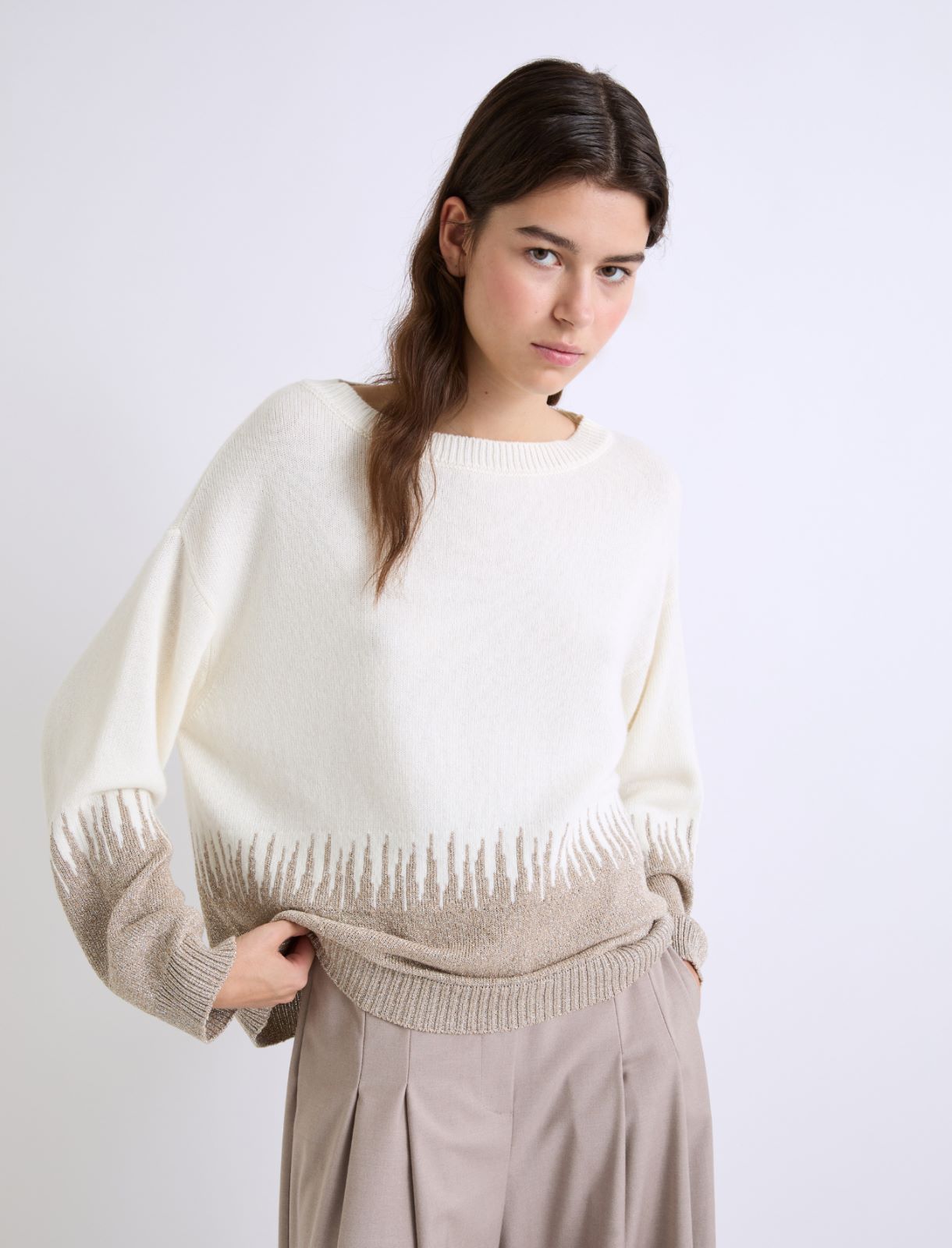 Elegant nuances and a play of inlays define this new loose-fitting sweater. Dropped shoulders and lurex cuffs for a new urban sophistication. Wool, viscose, and cashmere blend sweater. Regular fit. Round neckline. Dropped shoulders and long sleeves with lurex cuffs. Inlay at the hem.