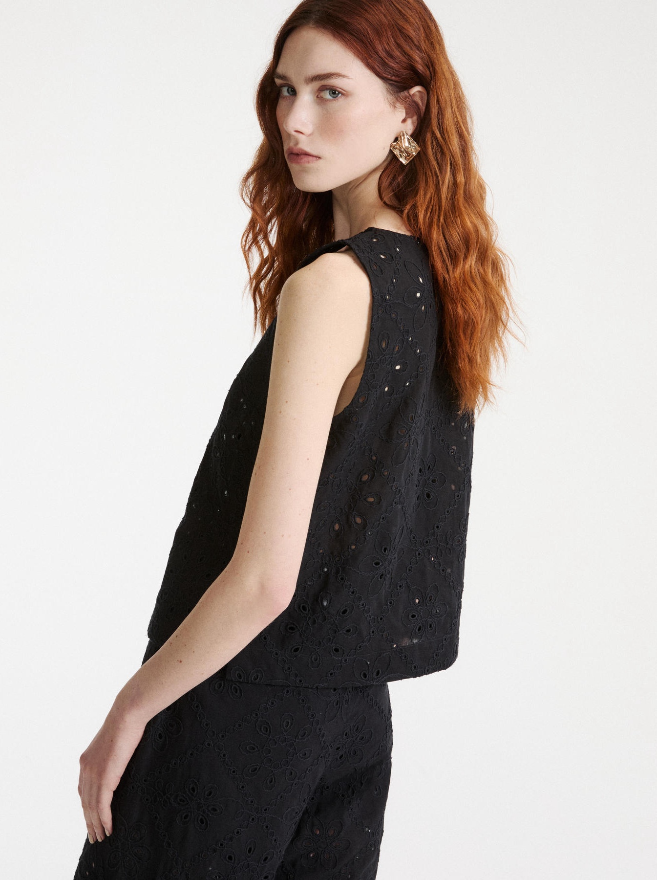 Sleeveless cotton muslin top with a broderie anglaise embroidery, straight fit, round neckline, sleeveless, teardrop closure and genuine off-white mother-of-pearl button at the center back, small side slits at the hem, unlined.