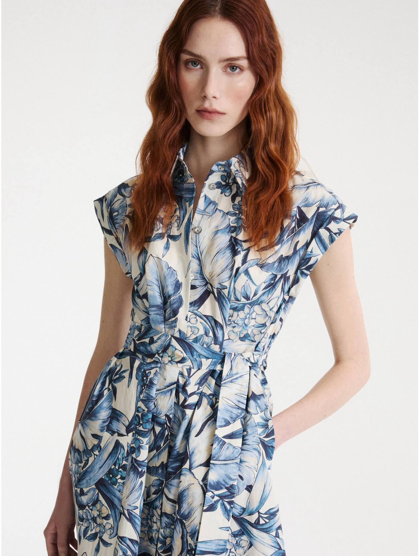 Cotton poplin shirt dress with a jungle print, fitted at the waist and flared at the bottom, shirt collar, shouldered sleeves with turn-ups, inset side pockets, concealed placket with genuine Tahitian mother-of-pearl buttons, gathered back yoke, and matching sash in the same fabric. Unlined.