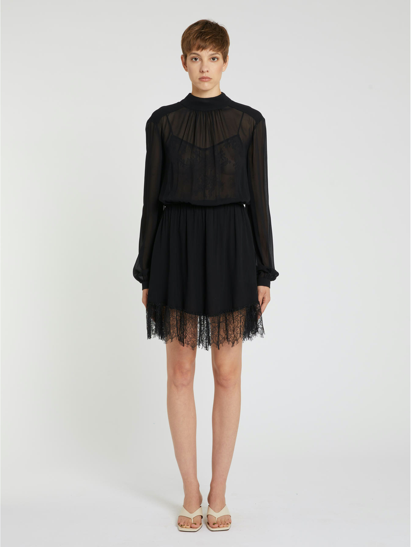 Georgette and lace dress. Regular fit. Stand-up collar with a tie band at the back. Lace band at the bottom of the skirt. Overlay design throughout.
