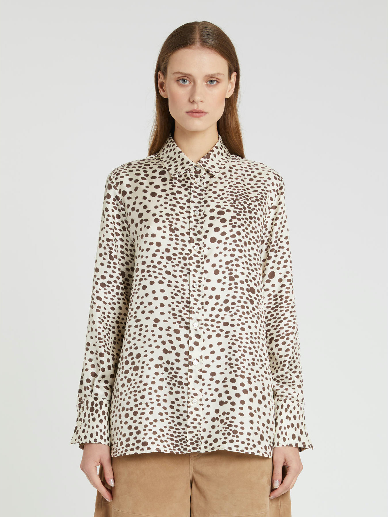 Printed silk twill shirt. Regular fit. Shirt collar. Exposed front button placket. Back yoke with pleat.