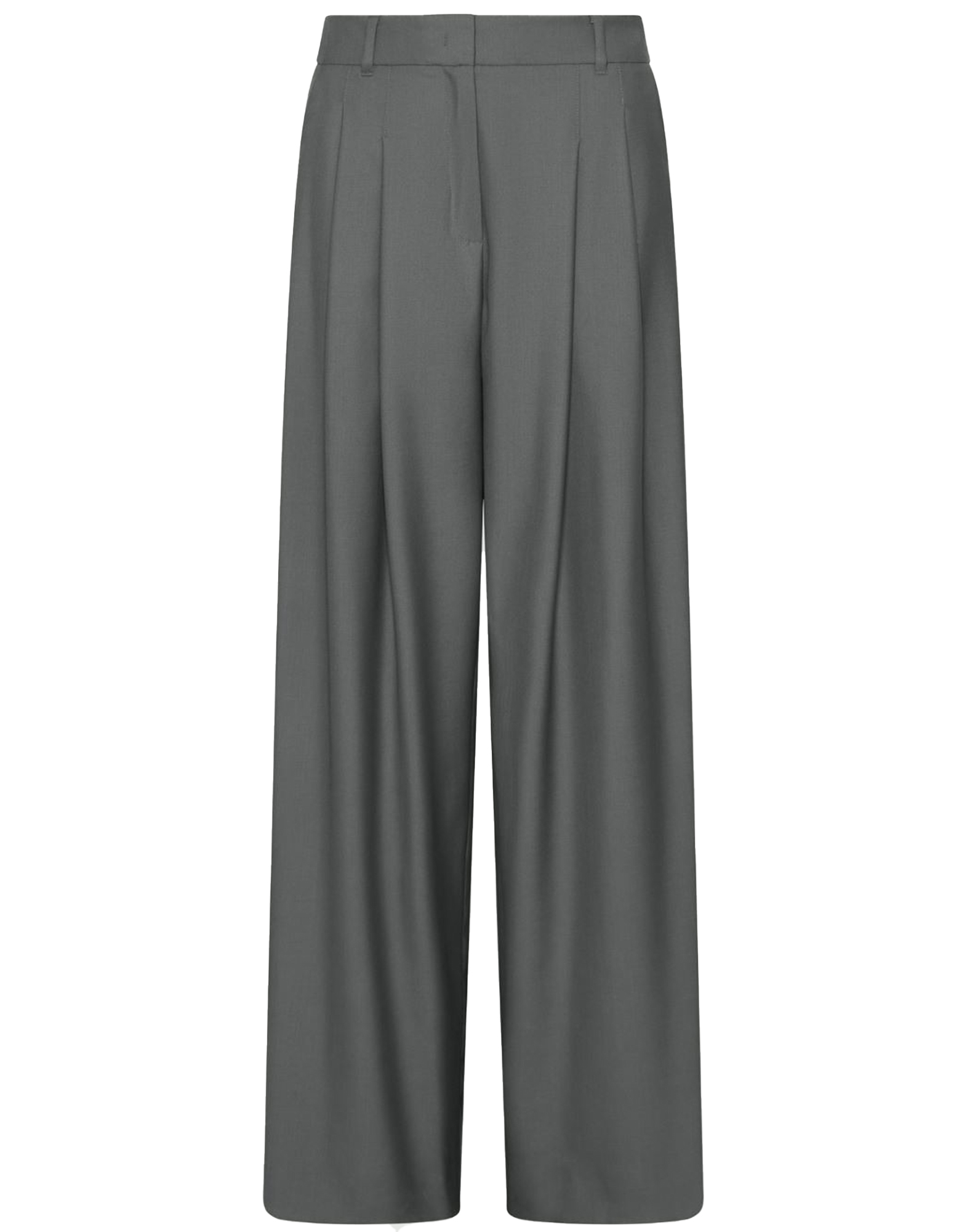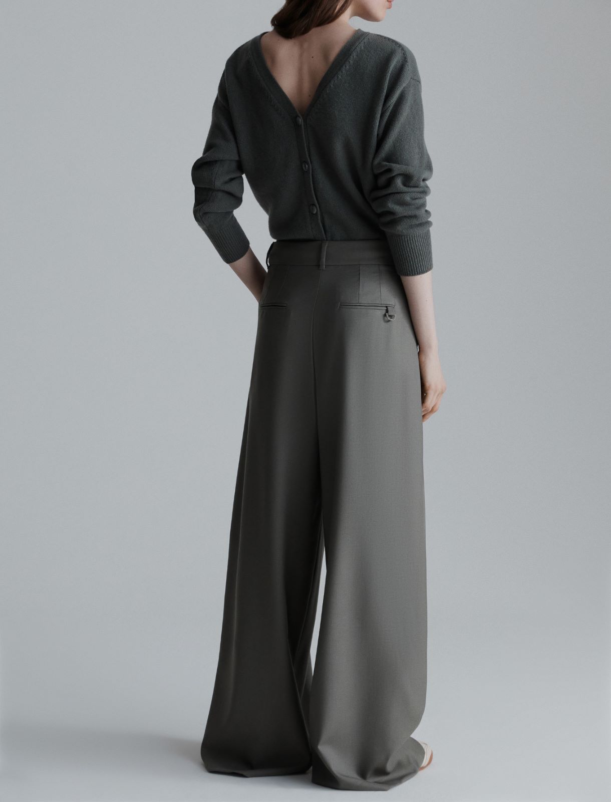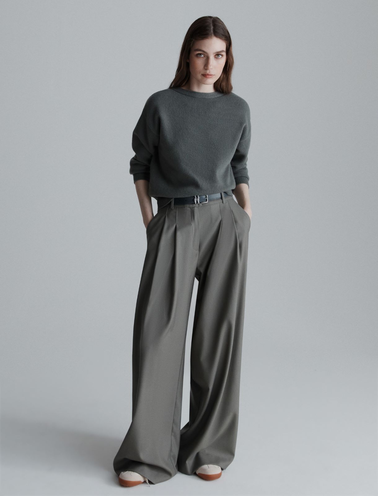 Urban elegance with a sophisticated touch: new wide-leg trousers in pure wool gabardine, with a double dart at the waist and a flowing silhouette. Wear them with a boxy sweater in earthy gray tones for a glamorous urban outfit.