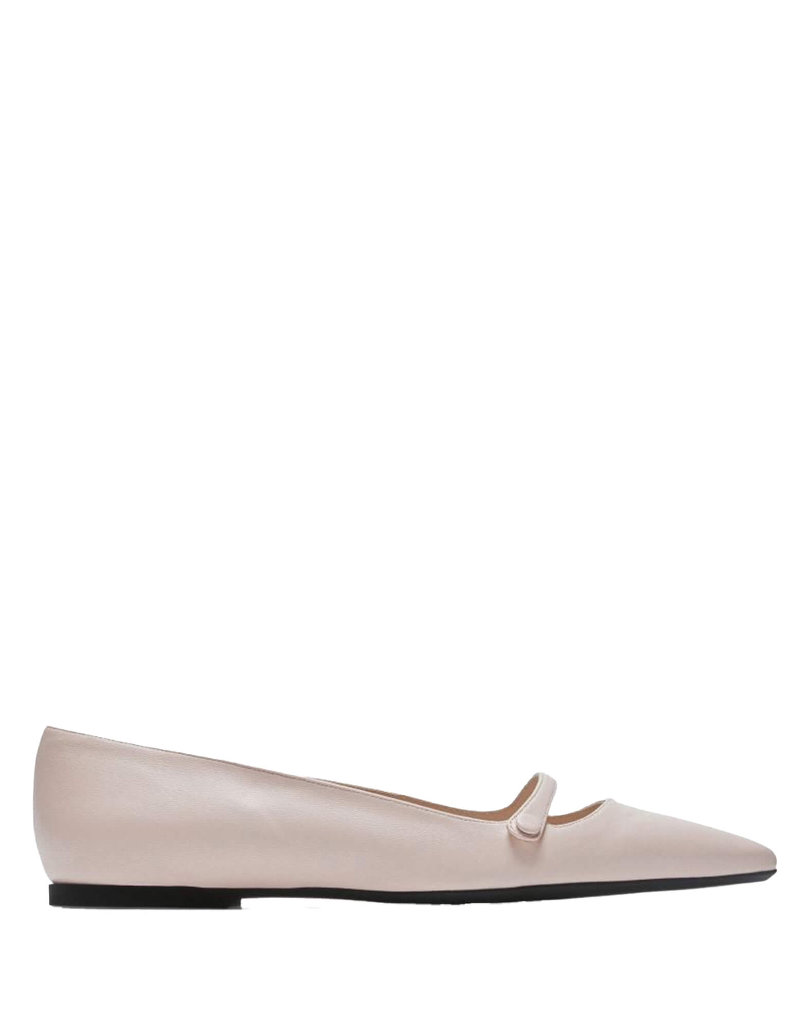 Beige/nude leather ballet flats with thin strap on the front. Straight tip. Low stacked heel. Show collection. Insole with logo. Made in Italy.