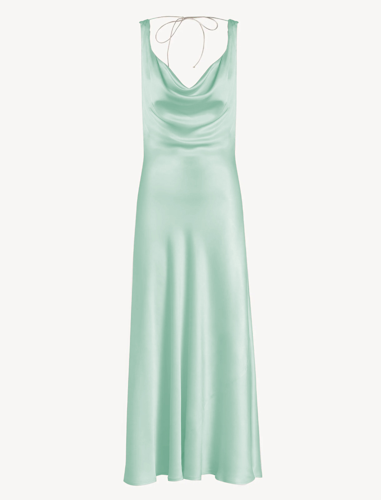 Satin midi dress with a draped halterneck. Fitted waist, wrap fit. The halterneck accentuates the shoulders and décolleté with a sophisticated touch, while the fitted waist sculpts the figure and slims the silhouette. Perfect for special occasions, party looks, ceremonies, and evening events.