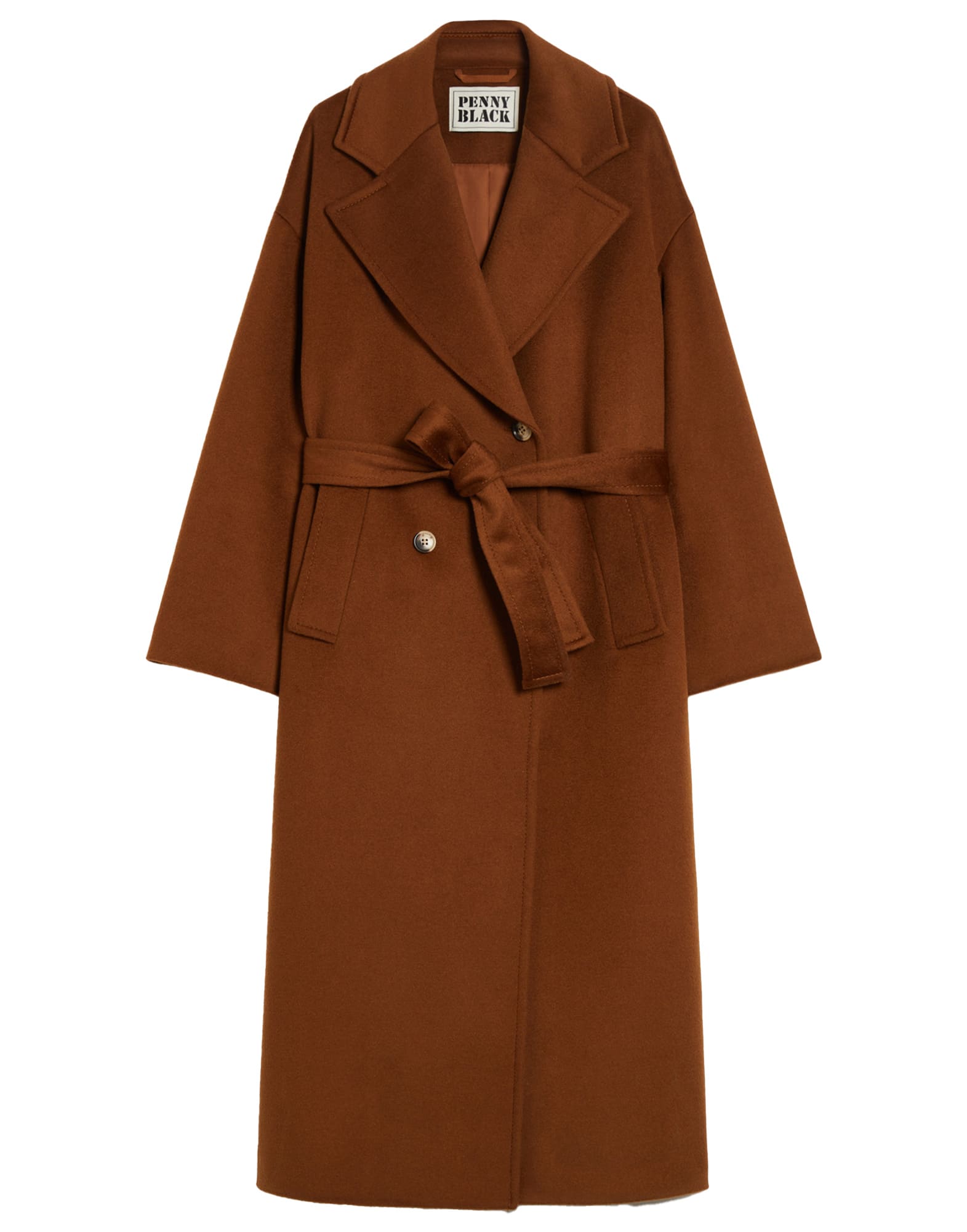 Pure wool drap. Double-breasted cut, wide and straight lines. Wide lapels, dropped shoulders. Welt pockets on the front. Deep slit on the back. Tone-on-tone stitching. Coordinated belt to tie at the waist. Lined garment