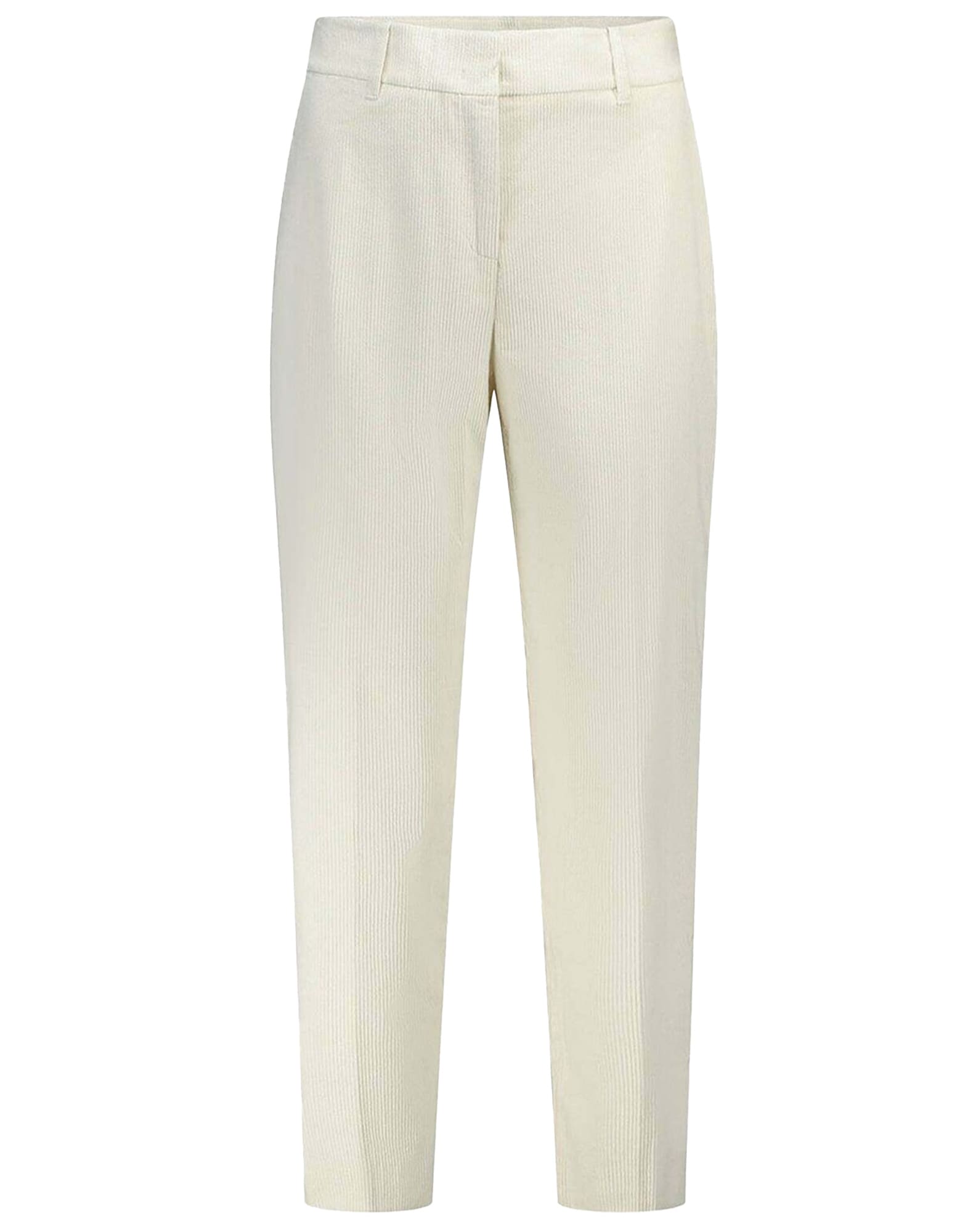 Stretch cotton blend corduroy. Relaxed, slightly tapered leg. Regular waist with belt loops. Ankle length. Pressed crease. Front slant pockets, back welt pockets. Concealed hook and zip closure.