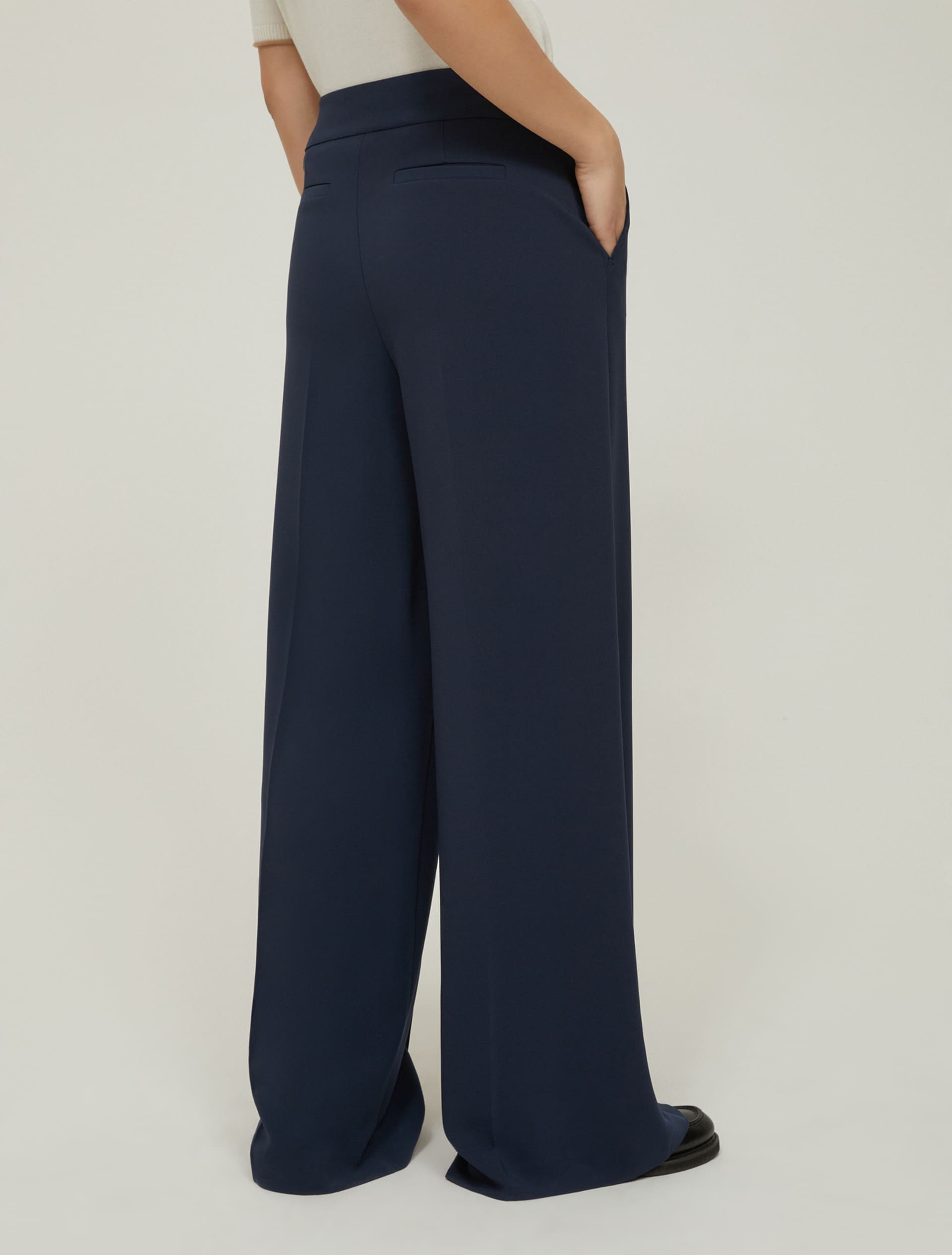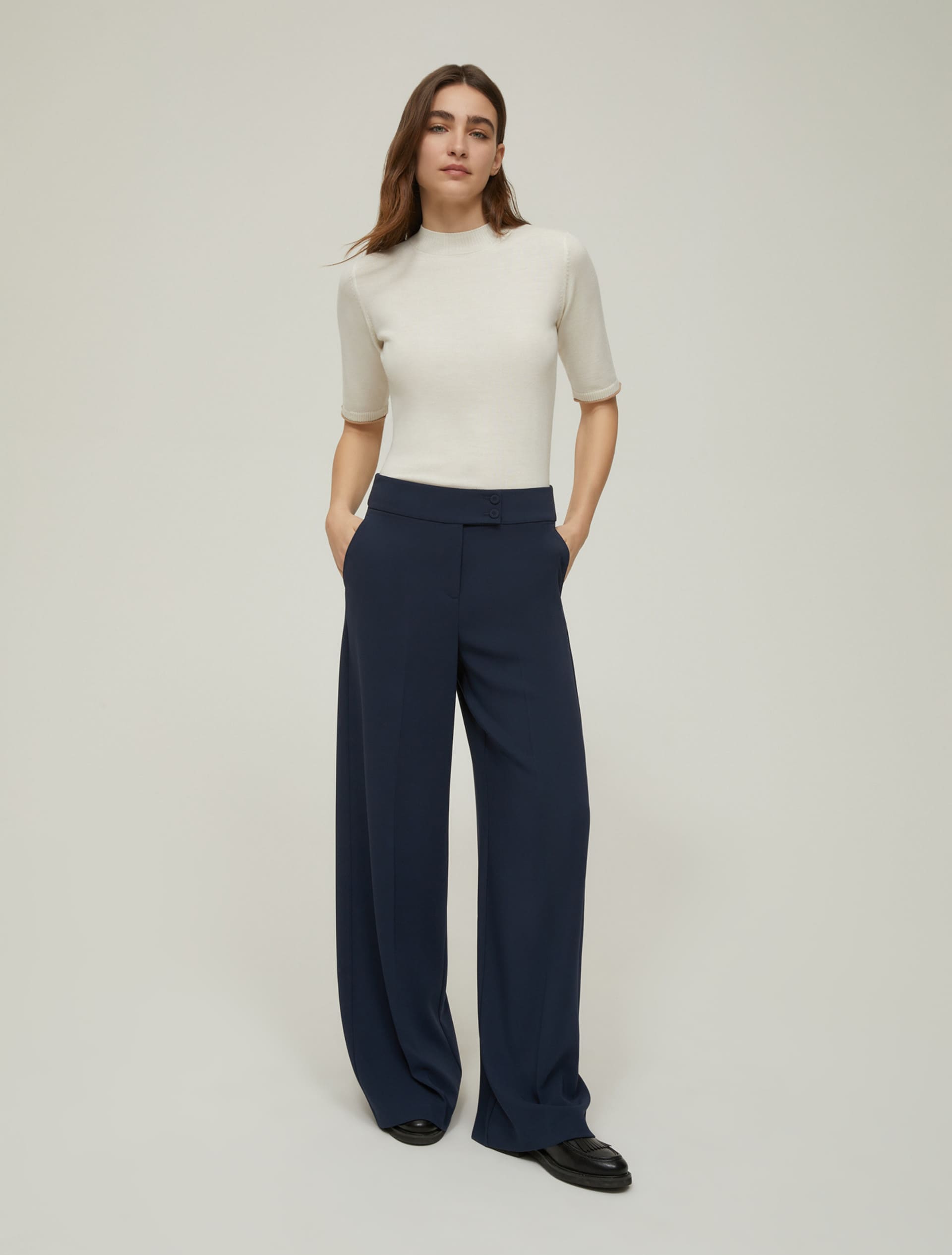 Bi-stretch cady. Wide, straight leg, regular waist. French pockets on the front, welt pockets on the back. Ironed crease. Concealed zip fastening and fabric-covered buttons. Matching blazer in the collection