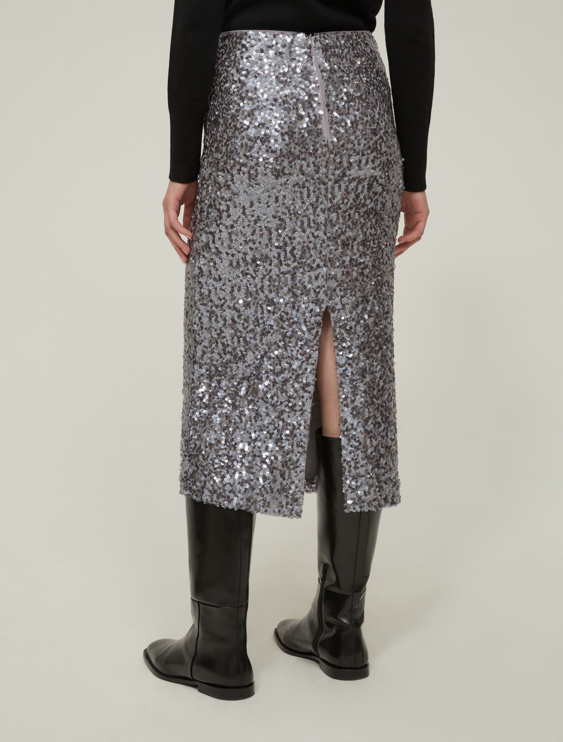 Stretch tulle jersey with embroidered sequins. Slim fit with straight lines. Regular waist. Back slit and zip closure. Smooth jersey lining.