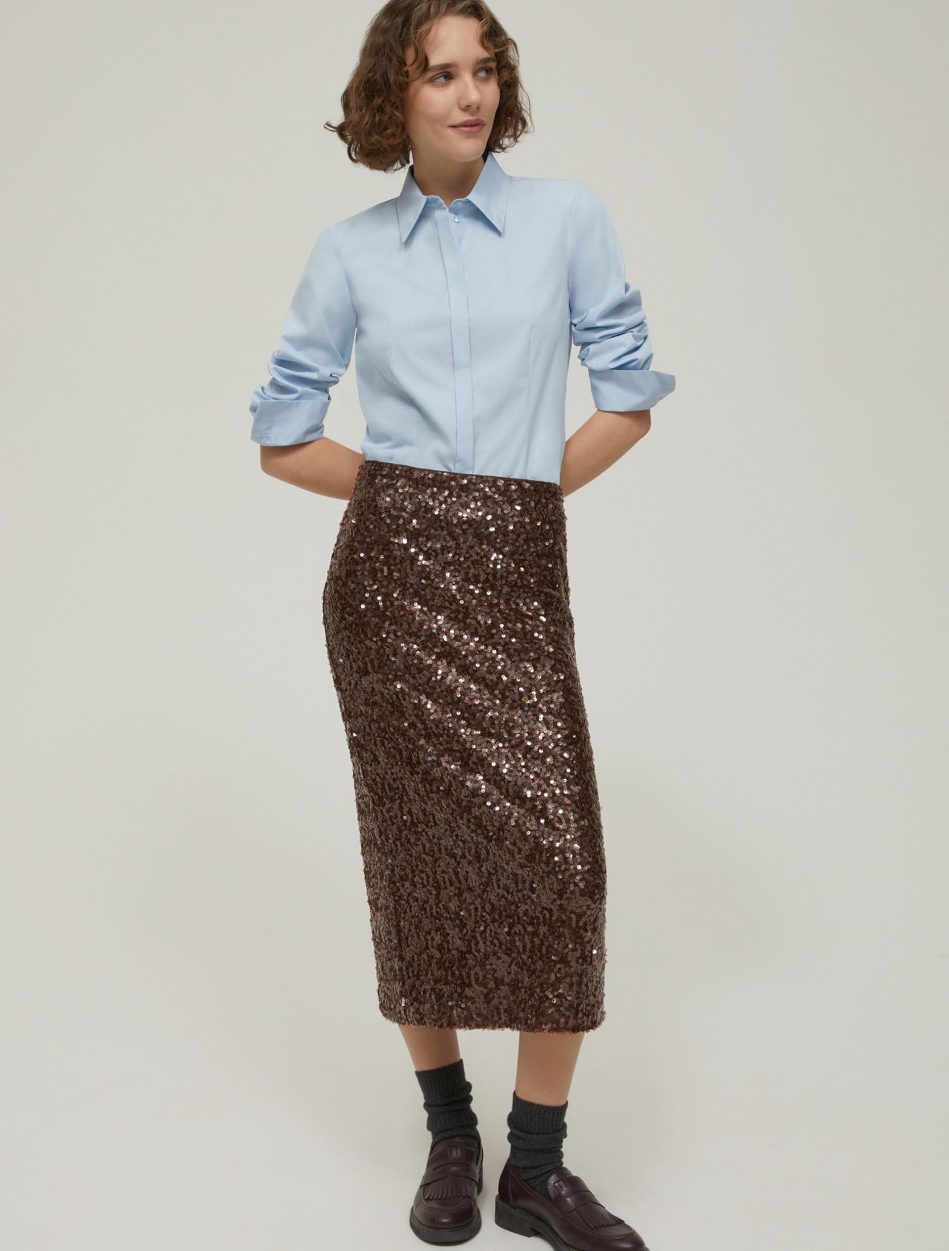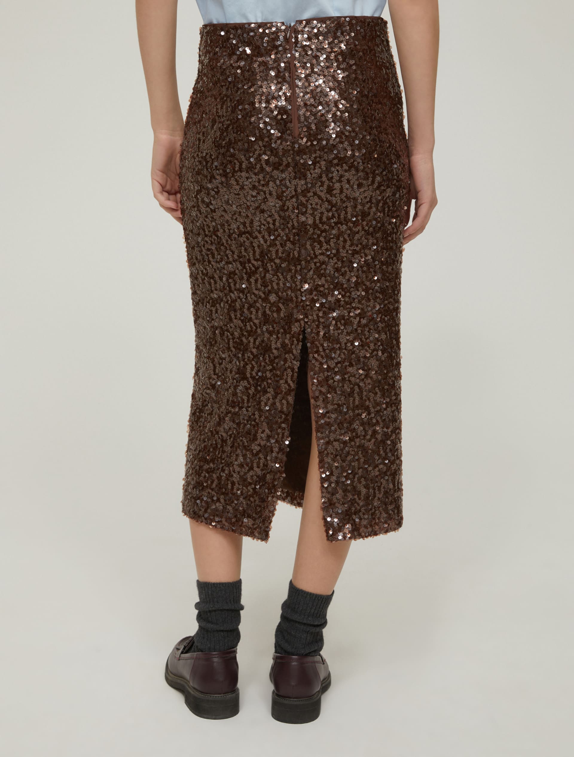 Stretch tulle jersey with embroidered sequins. Slim fit with straight lines. Regular waist. Back slit and zip closure. Smooth jersey lining.
