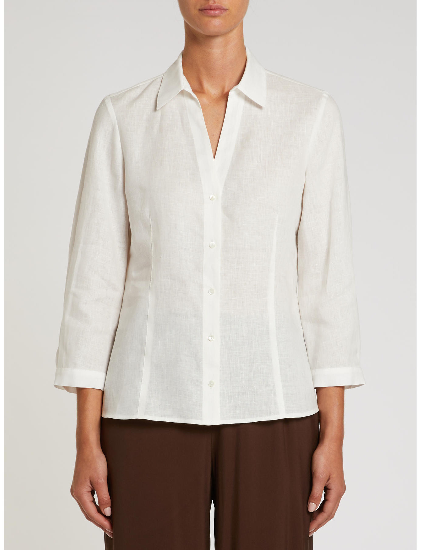 Pure linen shirt. Slim fit with pleats at the bust. V-neck collar. Three-quarter sleeves, slim buttoned cuffs. Front buttoning.