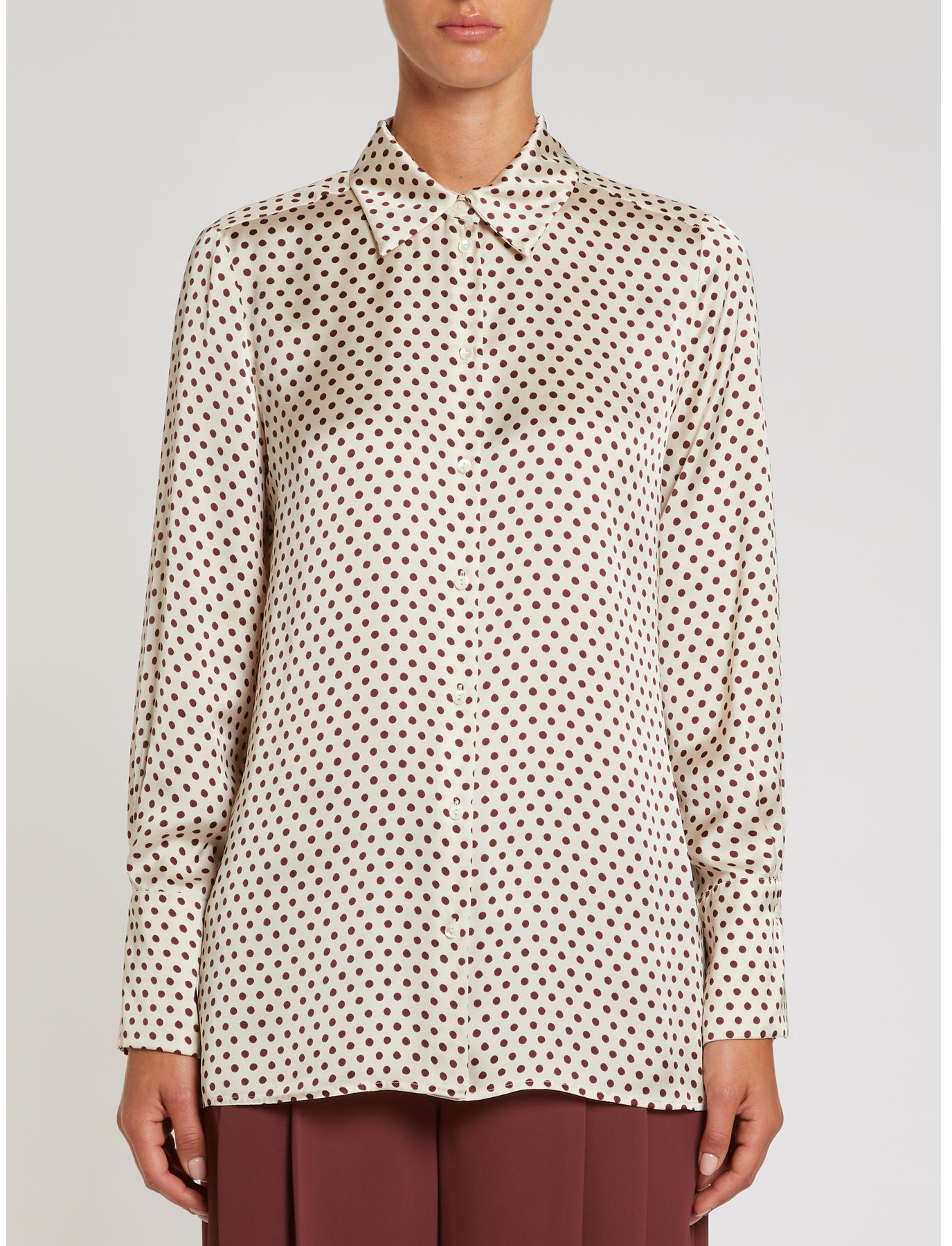 Flowing printed satin shirt. Straight lines, regular fit. Classic collar, long sleeves, high cuffs. Front button closure.