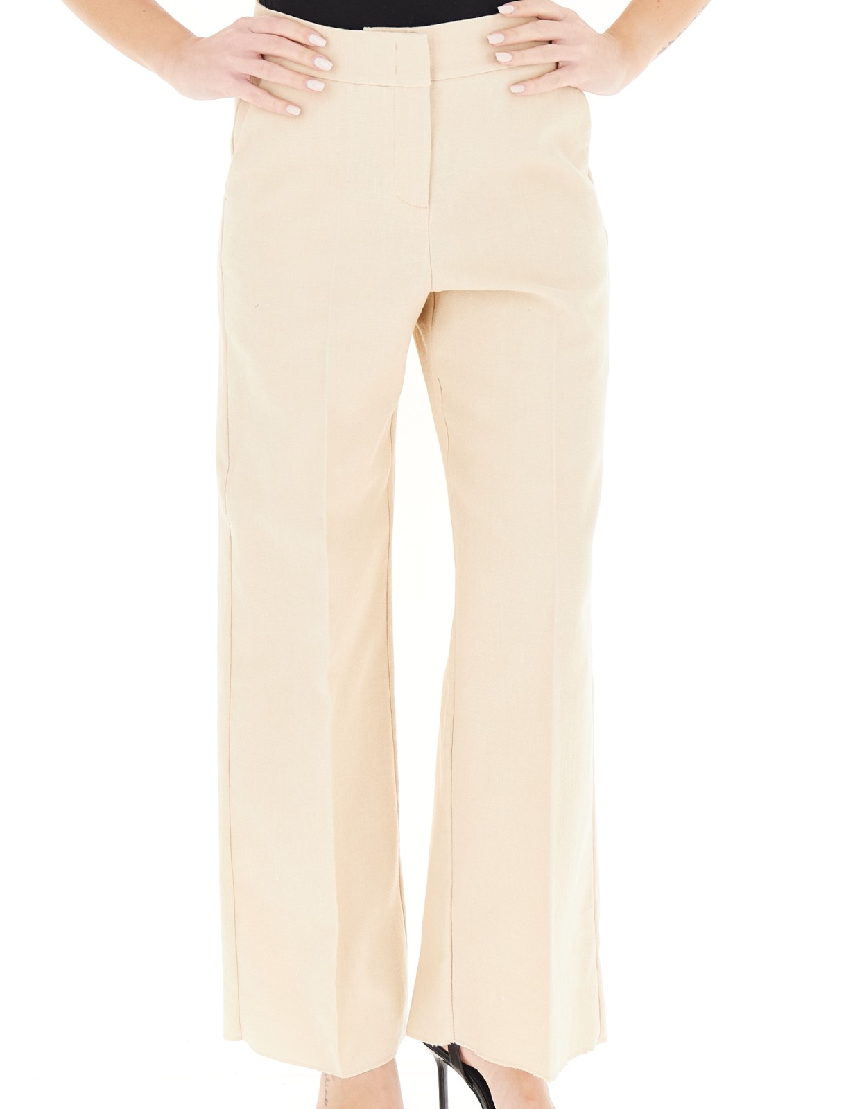 With a clean design and soft lines, these cotton and linen trousers interpret classic tailoring with a modern, relaxed attitude. Diagonal-texture stretch cotton and linen. Straight leg. Regular waist. Front slant pockets, back welt pockets. Pressed crease. Concealed hook-and-eye closure. Matching blazer in the collection. Loose fit.