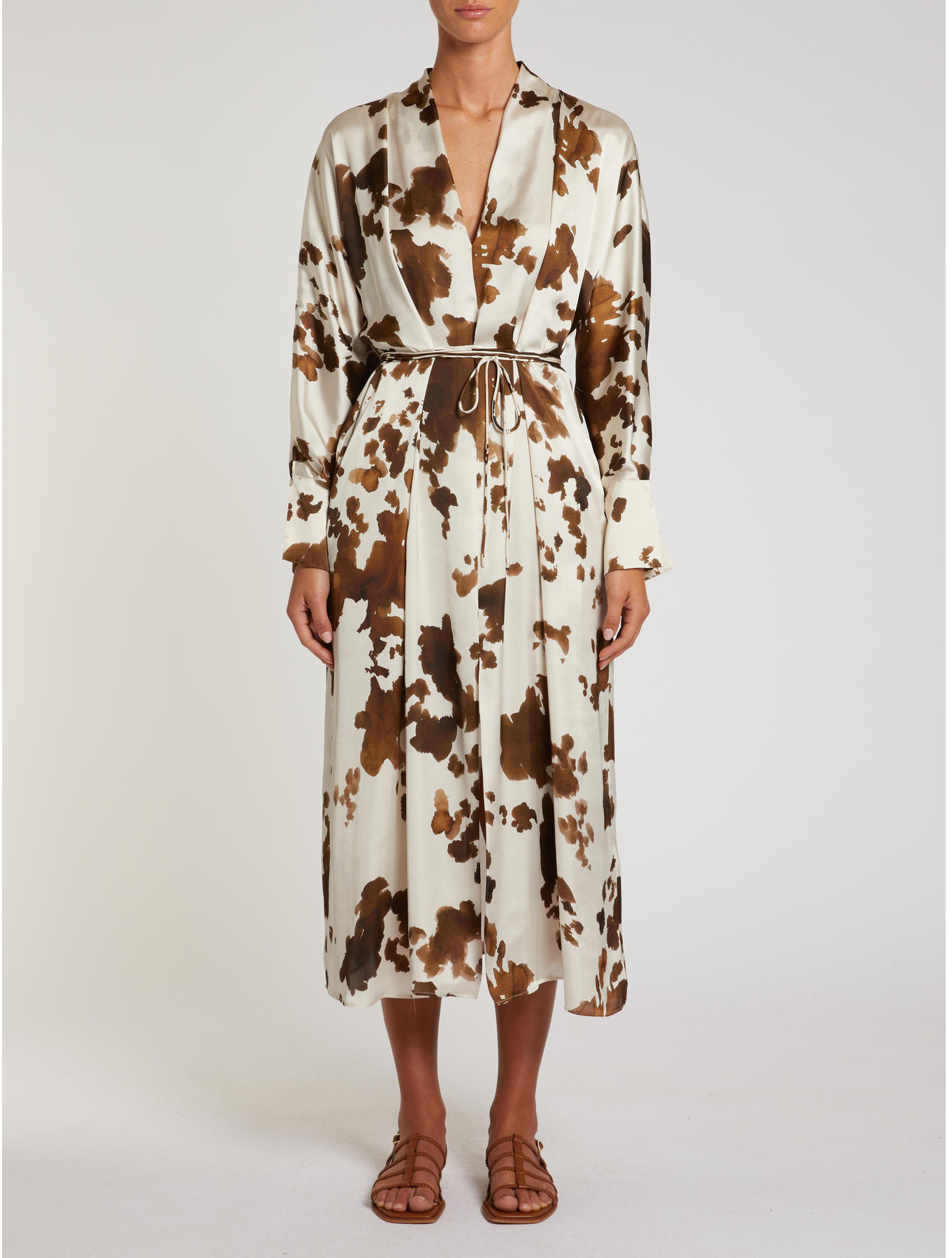 With a flowing silhouette in shiny satin, this cow print dress reinterprets country chic.